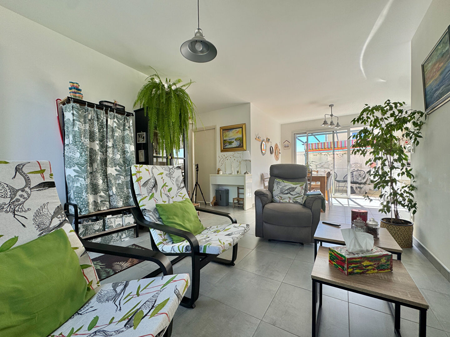 ...Un salon séjour spacieux et lumineux avec cheminée, ouvrant sur une véranda exposée plein sud,...