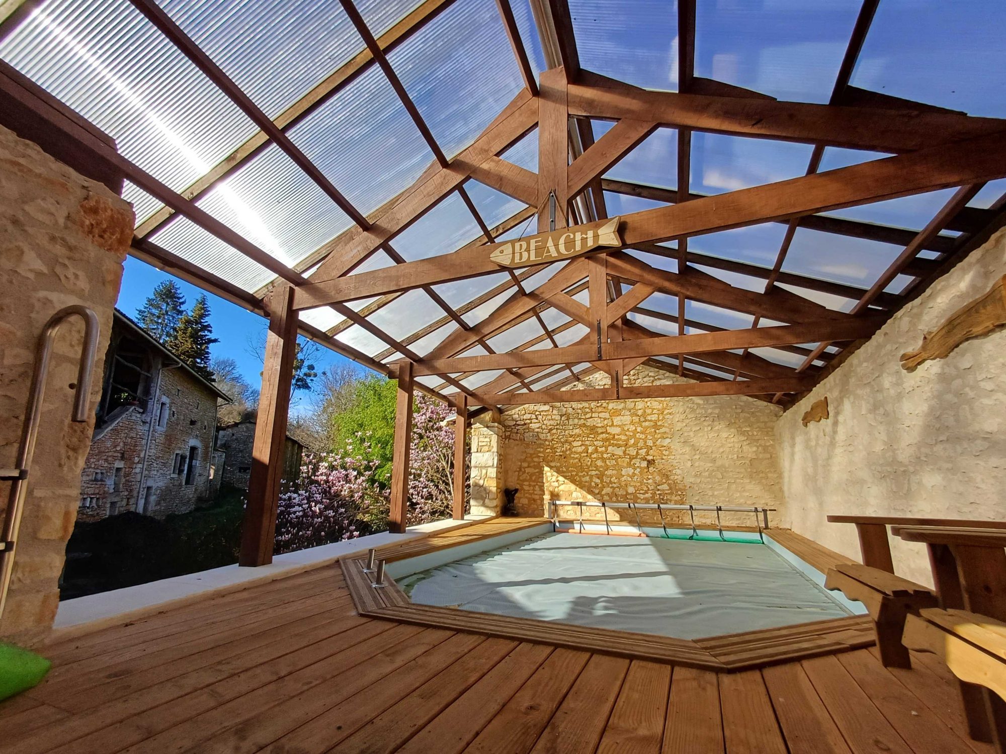 ...75 m² avec poêle à bois + 1 split avec thermostat, donnant accès à une terrasse béton côté EST,...