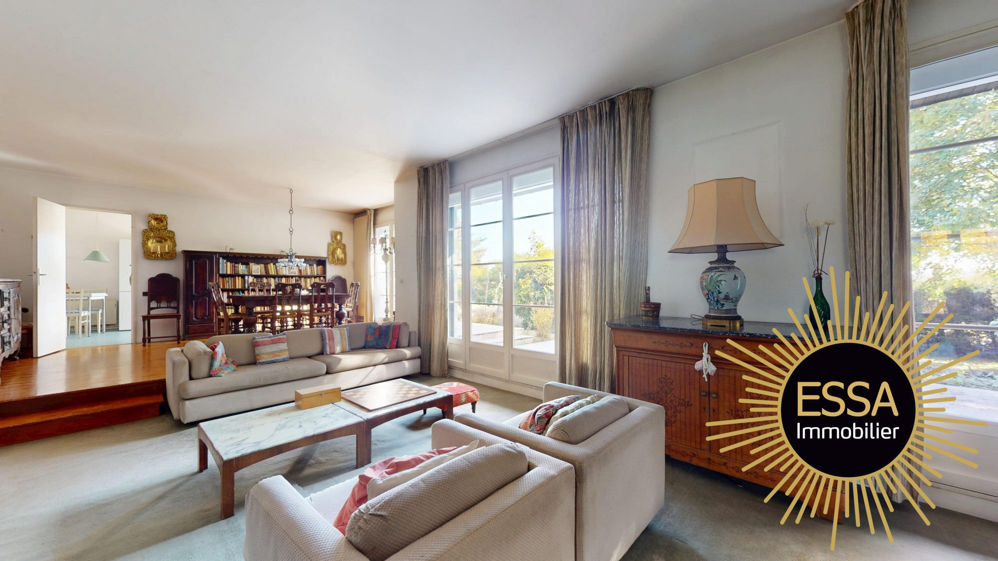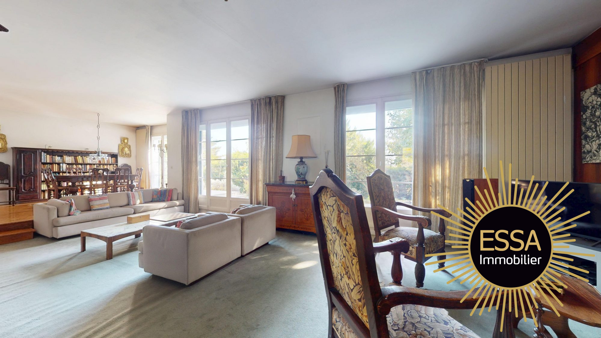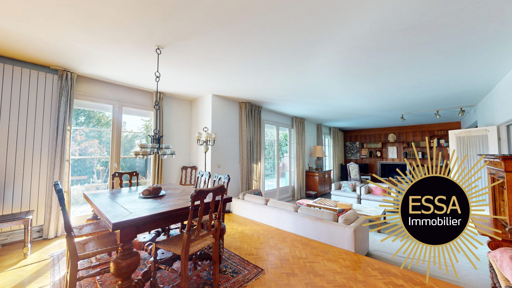 ...Entrée cathédrale, double réception de 45 m², cheminée, baies vitrées sur terrasse et jardin...