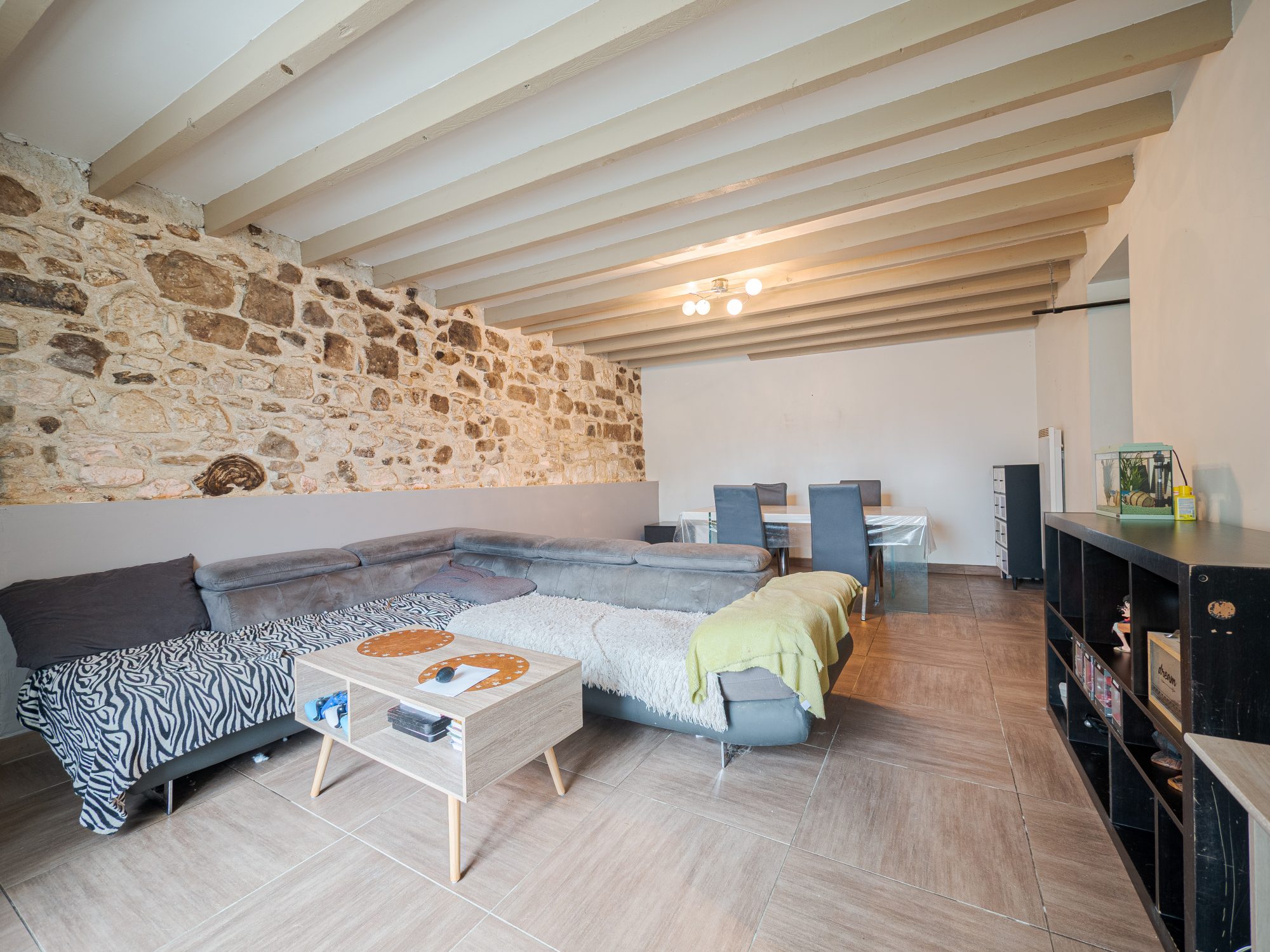 ...Charmante maison mitoyenne en pierre, alliant authenticité et cachet grâce à ses poutres...