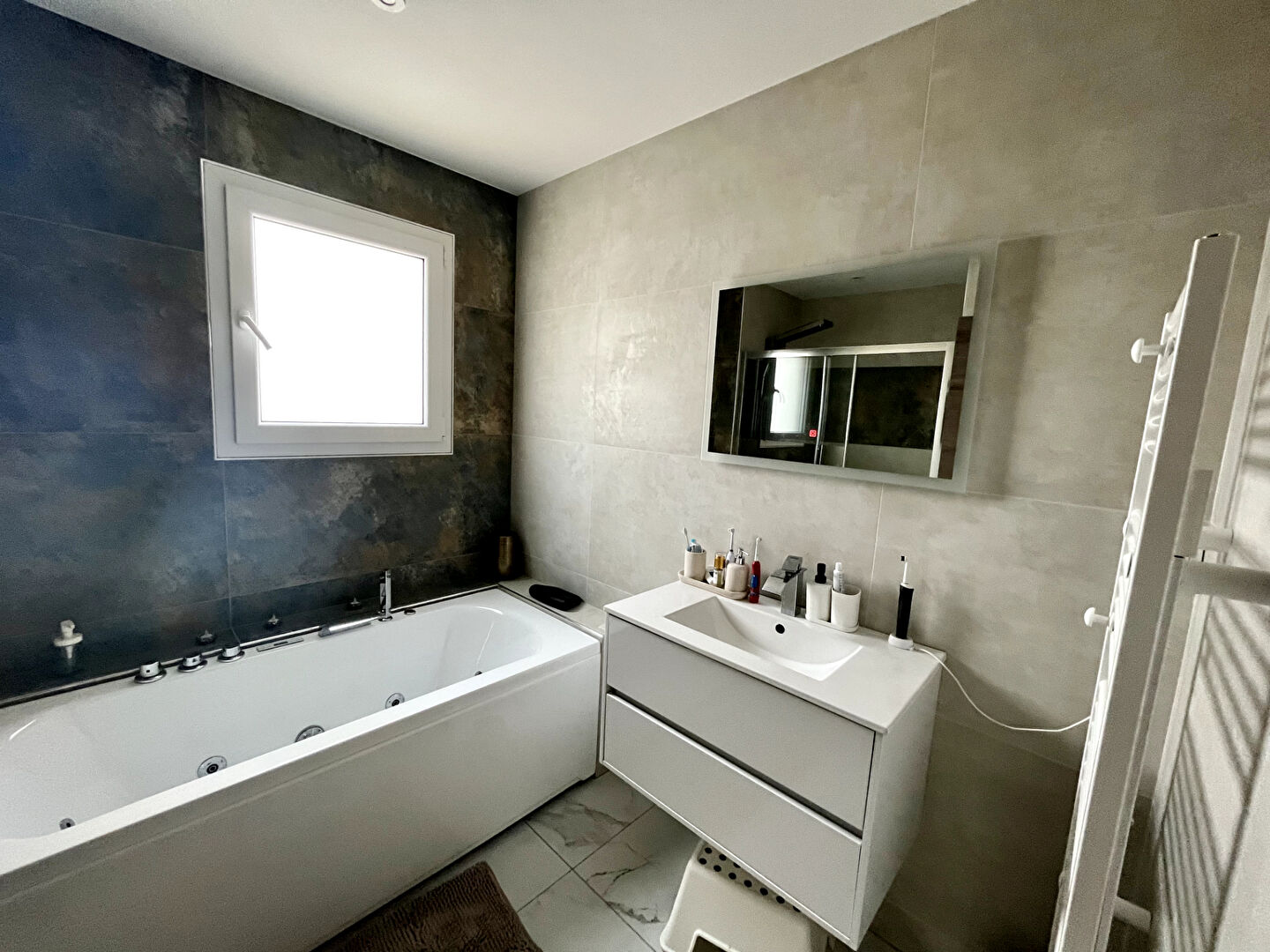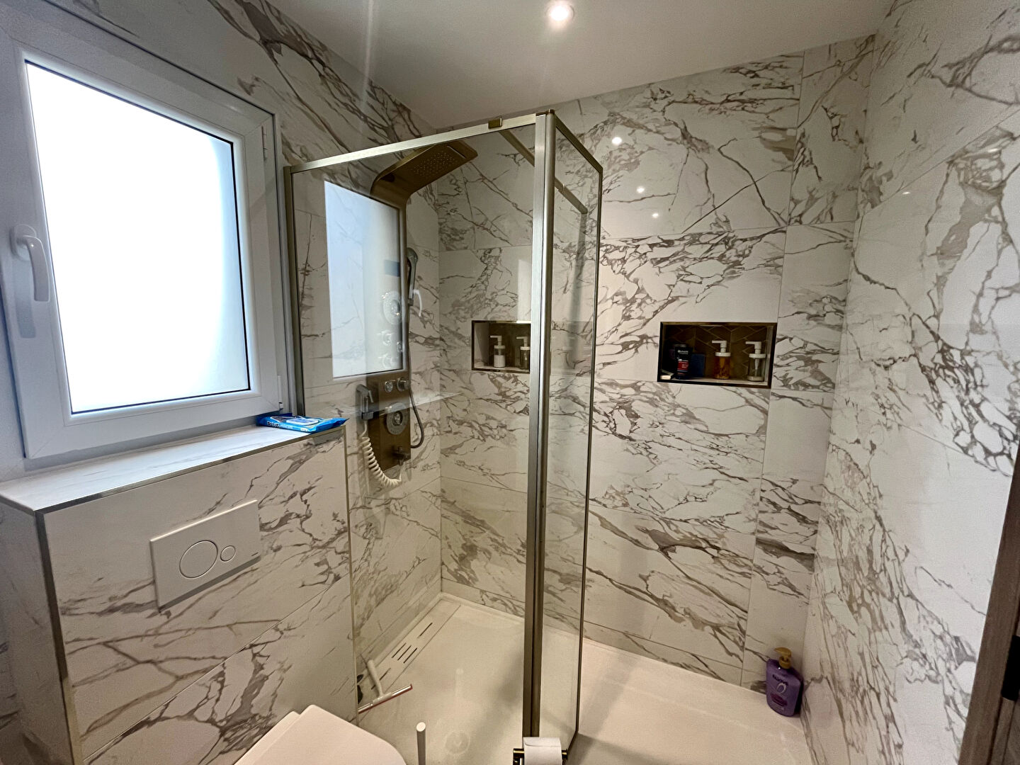 ... grands placards de rangement, salle de bains avec douche et baignoire, toilettes, buanderie.