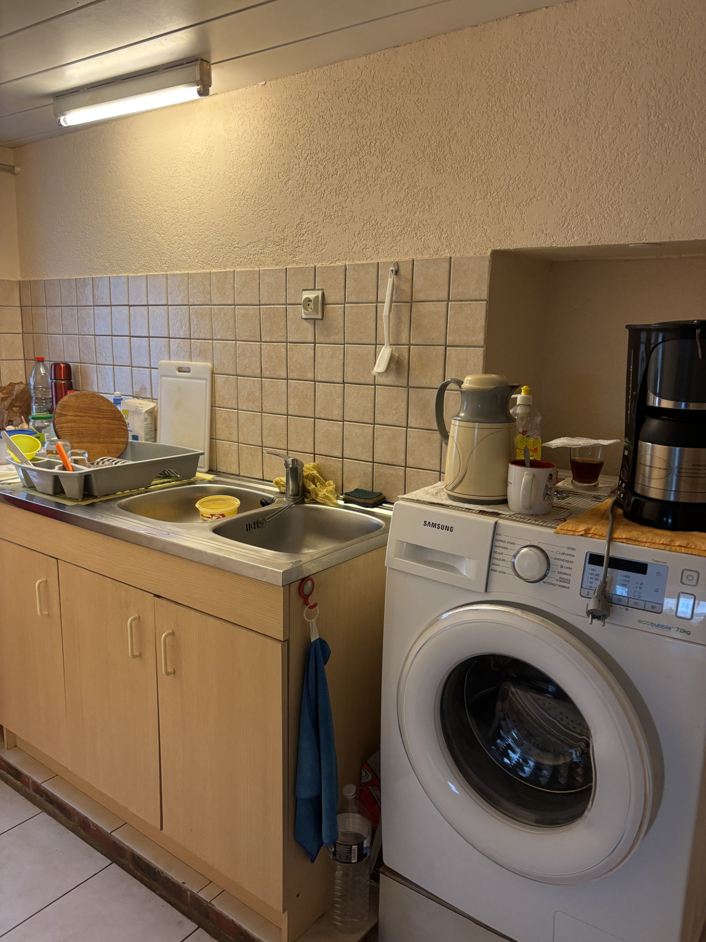 ...Tout droit, un petit couloir avec des placards mène à la salle d'eau, équipée d'un WC, d'un...