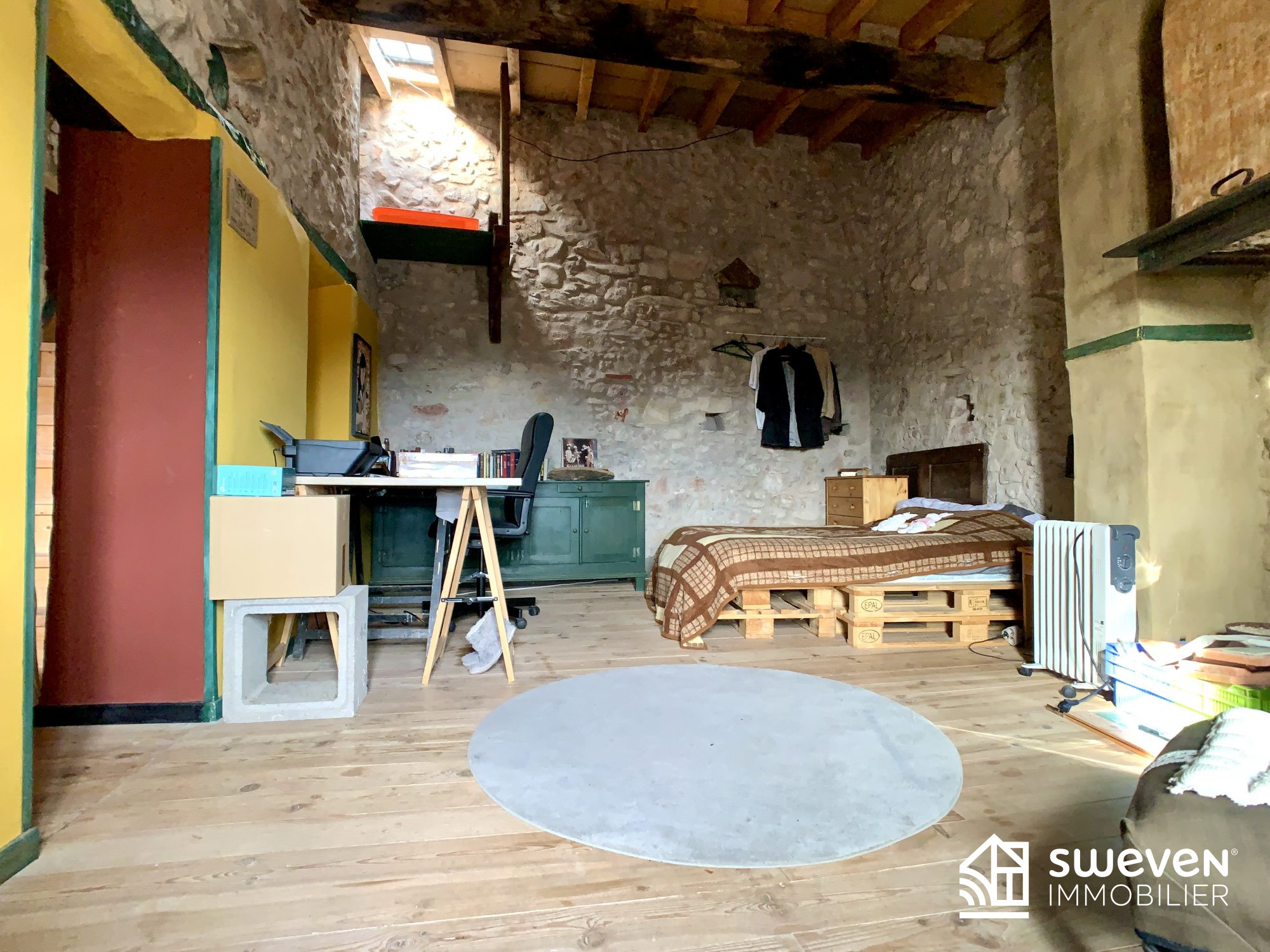 ...Pierres apparentes, poutres, poêle à bois et combles aménagés créent une atmosphère chaleureuse,...