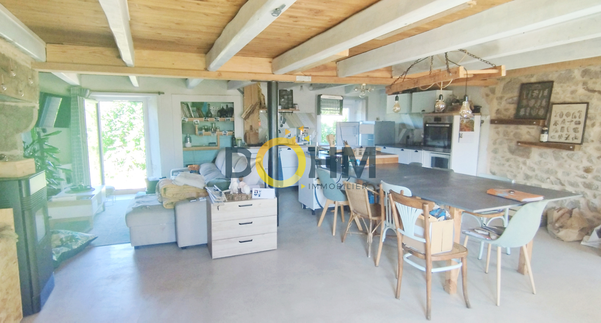 ...Le niveau principal se compose d'une salle à manger avec son poêle à bois, un salon, une cuisine...