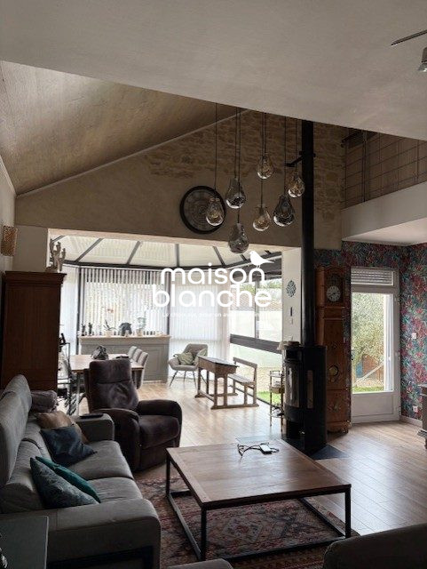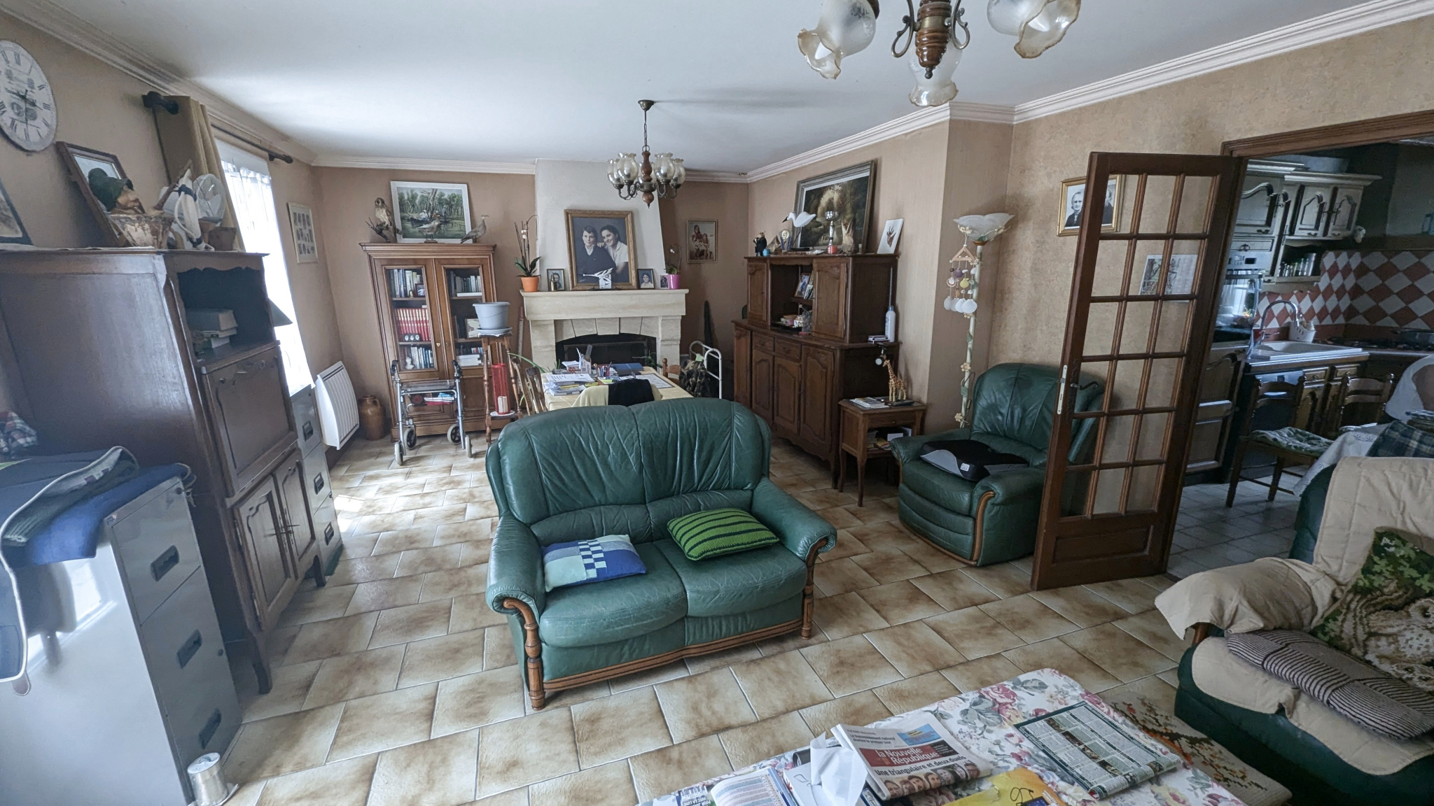 ... (9,57 m²) avec placard, un séjour carrelé avec cheminée-insert (31 m²), une cuisine aménagée carrel...