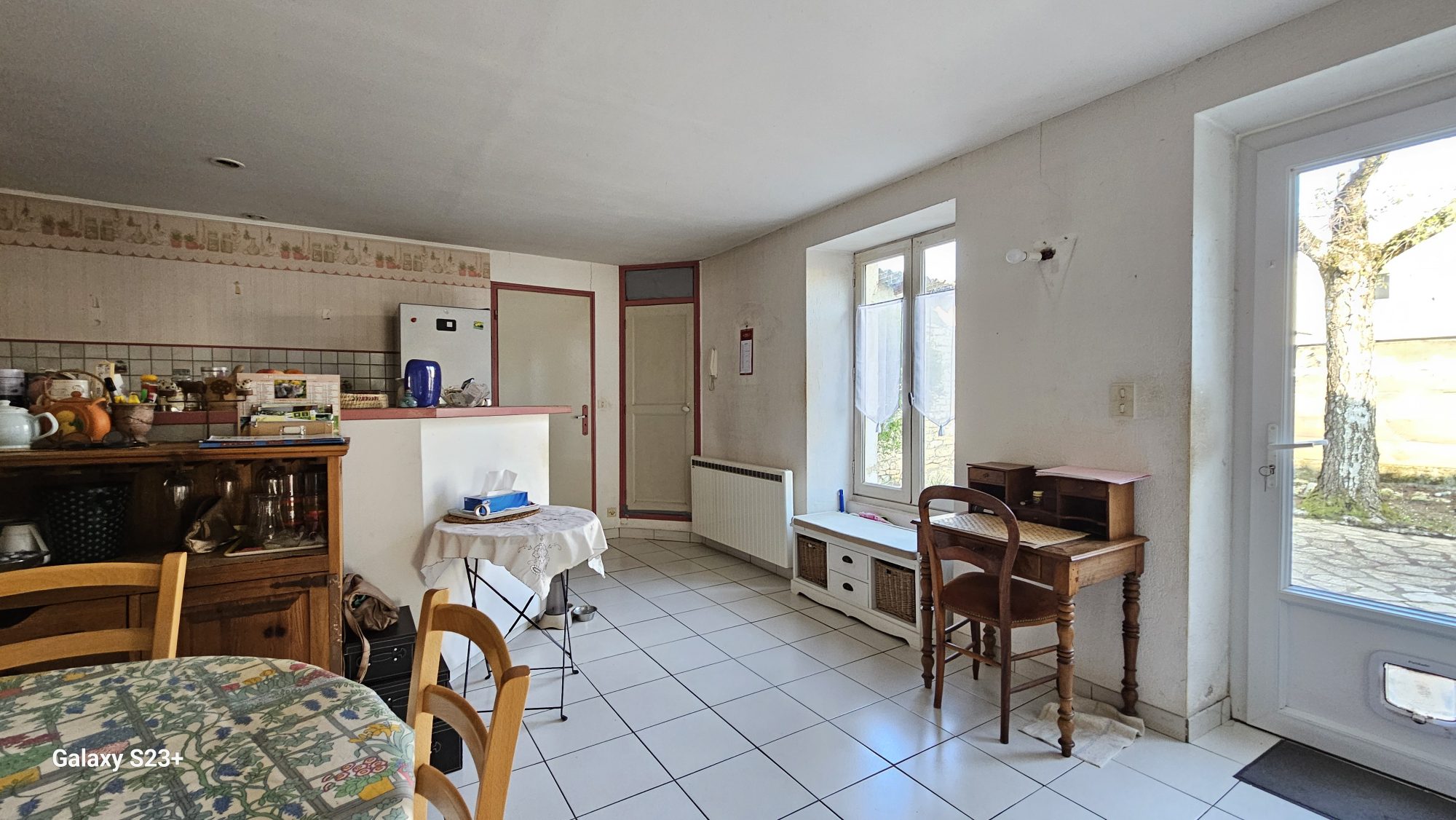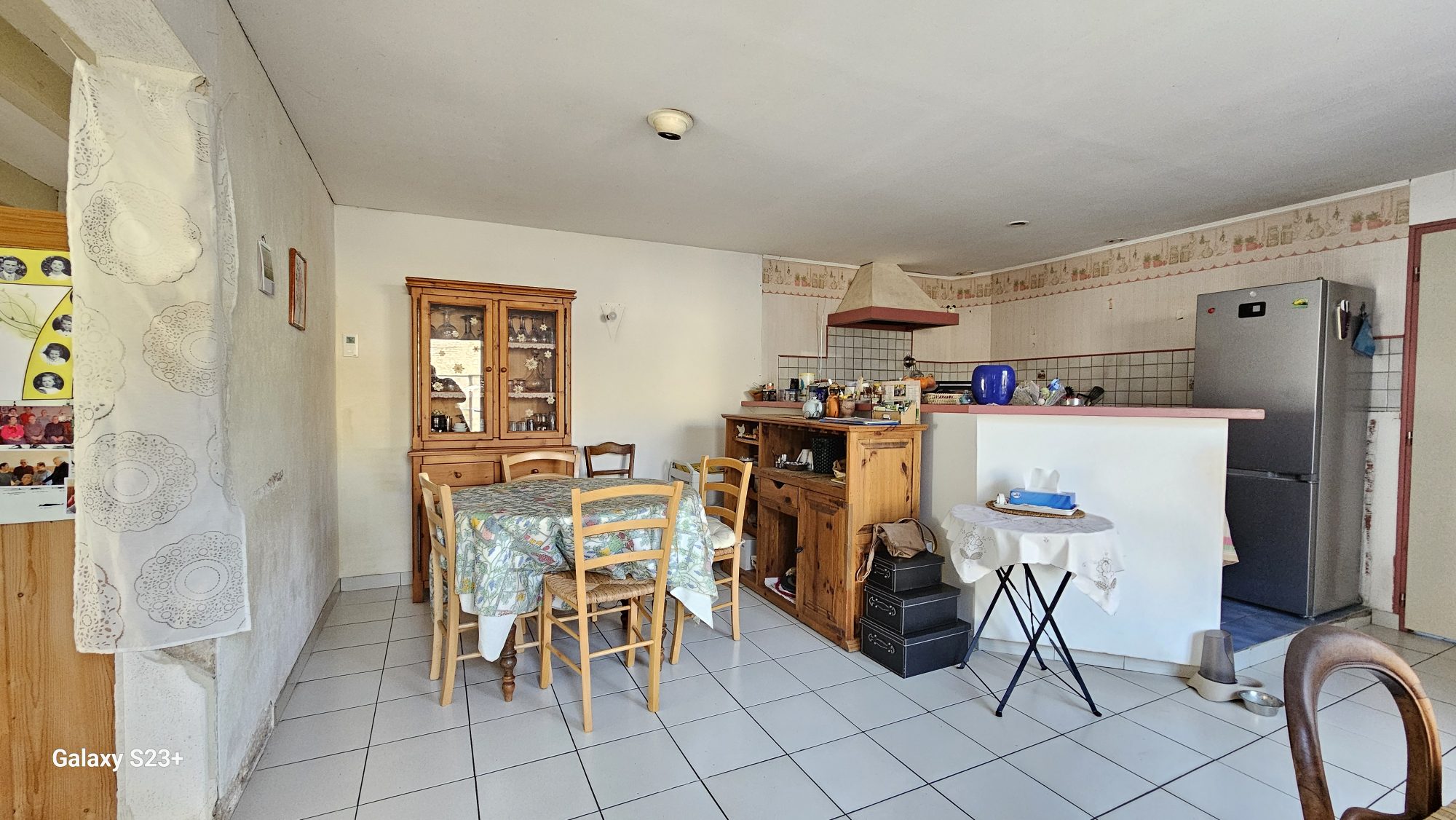 ...Entrée dans la pièce de vie lumineuse avec son poêle à bois, suivie d'une grande cuisine aménagée...