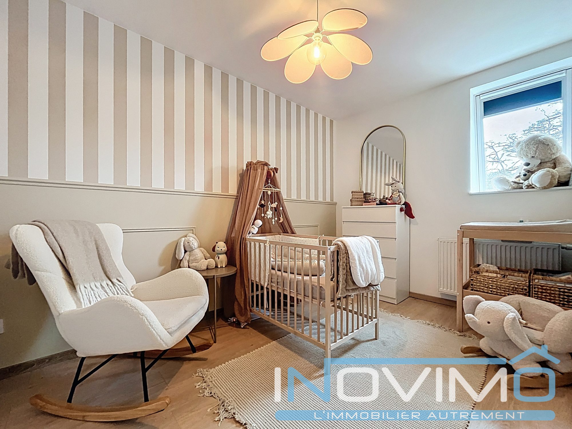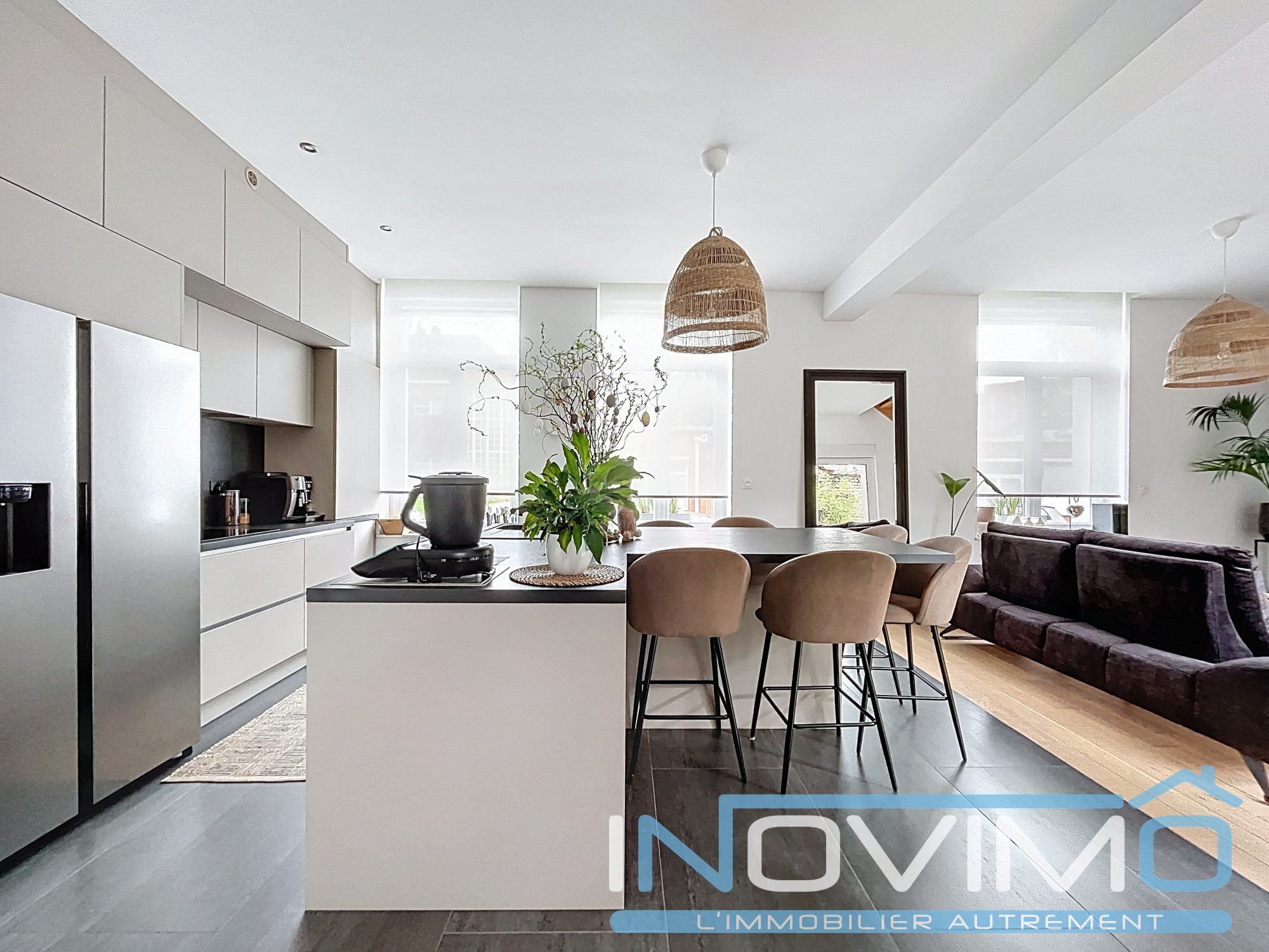 ... pièce de vie moderne ouverte de 60m2 sur une cuisine aménagée et équipée moderne, A l'étage, retrou...