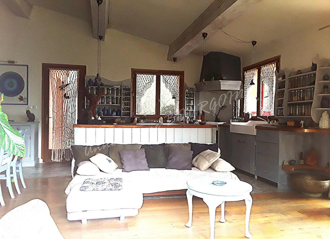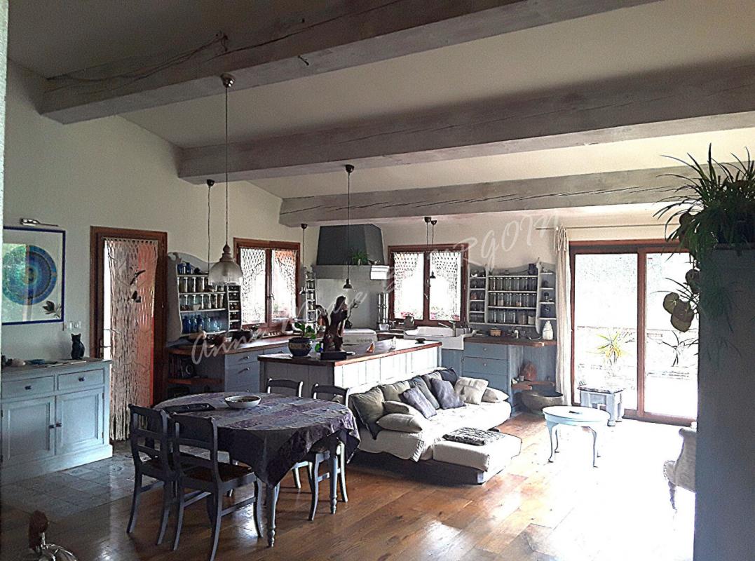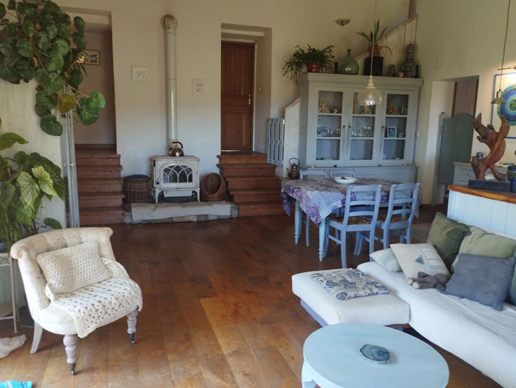 ... un séjour/cuisine lumineux de 49 m² environ, équipé d'un poêle à bois Jotul , un large ilot central...