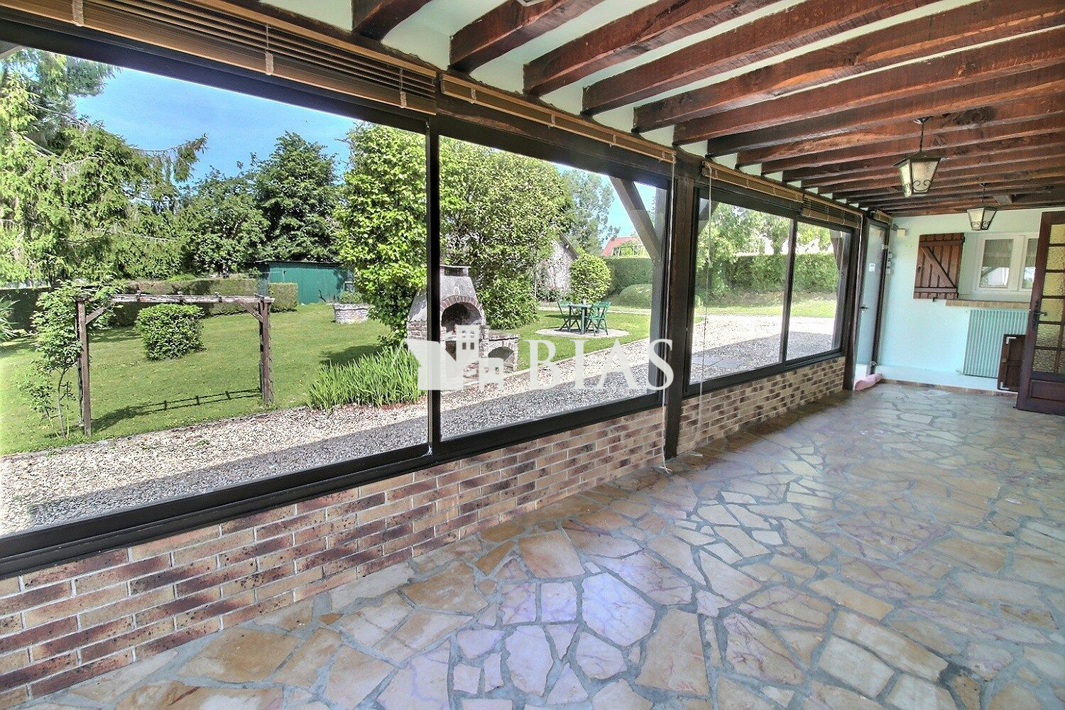 ...Elle comprend une cuisine aménagée, un salon avec cheminée donnant sur une grande véranda, deux...