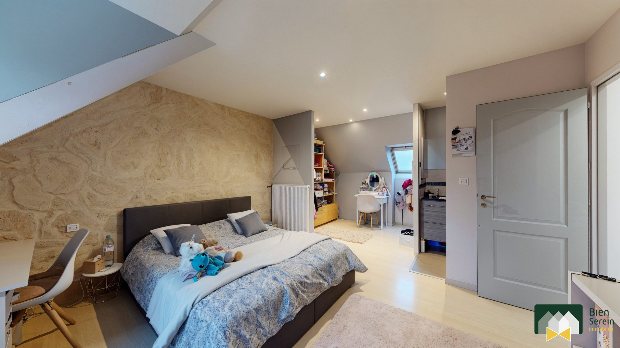 ...À l'étage : 2 chambres, dressing, salle de bains avec baignoire et douche, wc, rangement...