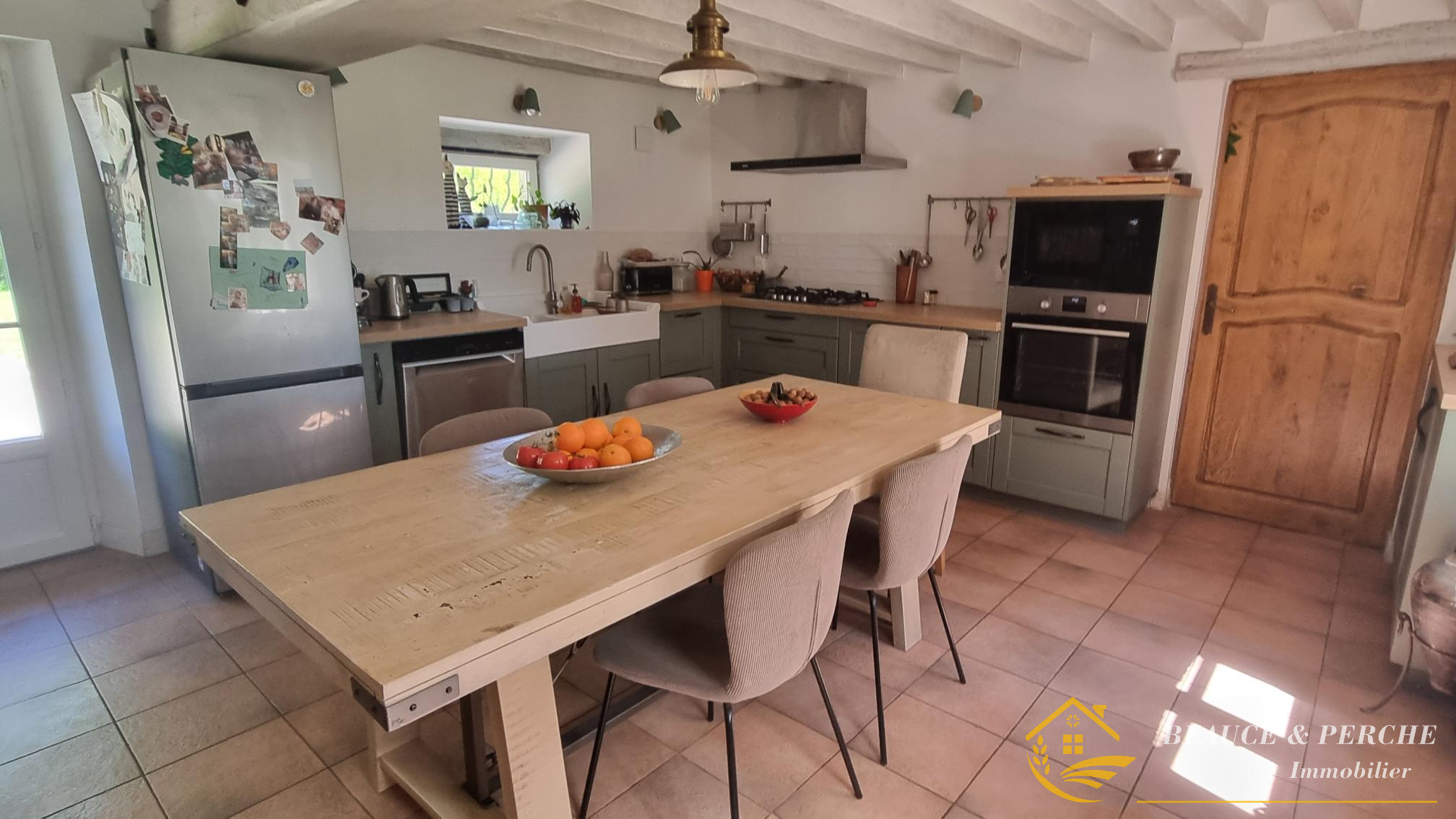 ...Elle vous offre une salle à manger ouverte sur une cuisine aménagée et équipée avec poele à...