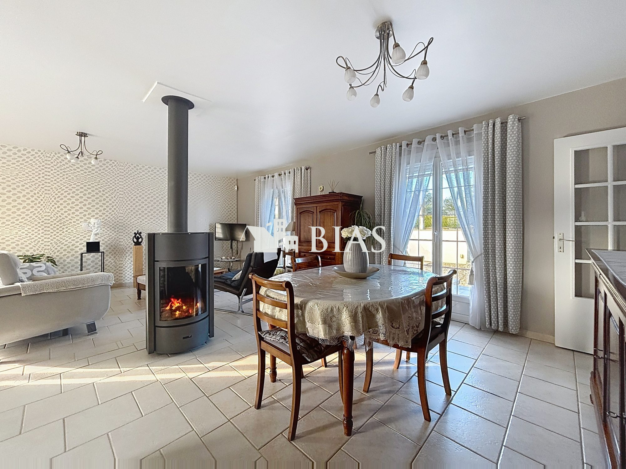 ... salon-séjour lumineux avec une cheminée insert, une cuisine aménagée ouverte sur un espace repas, u...