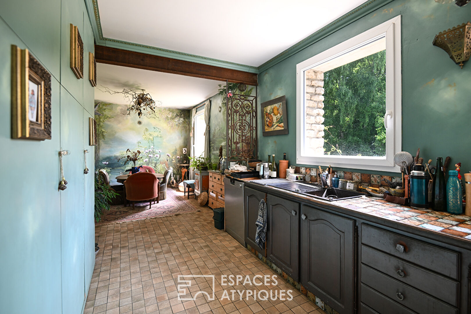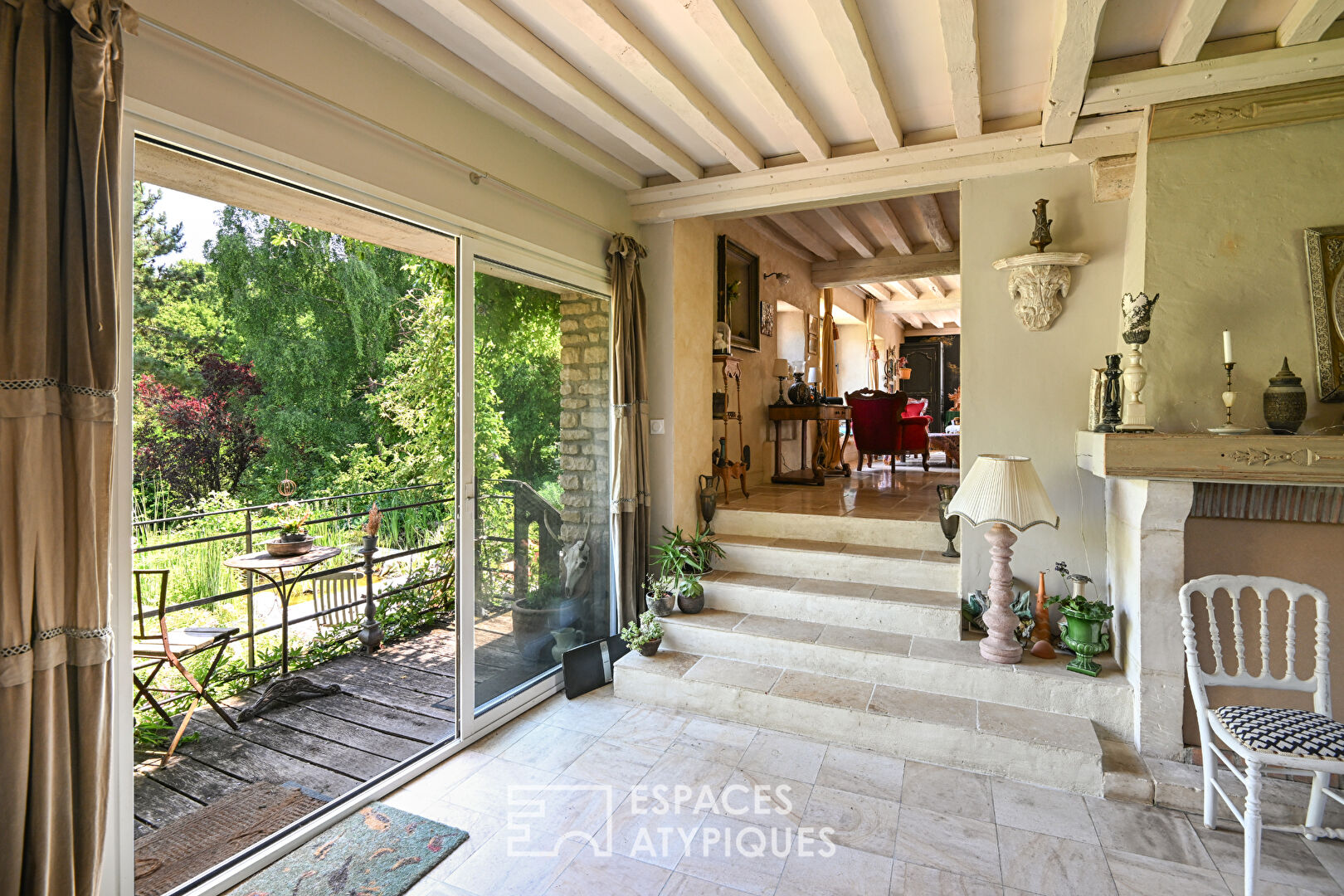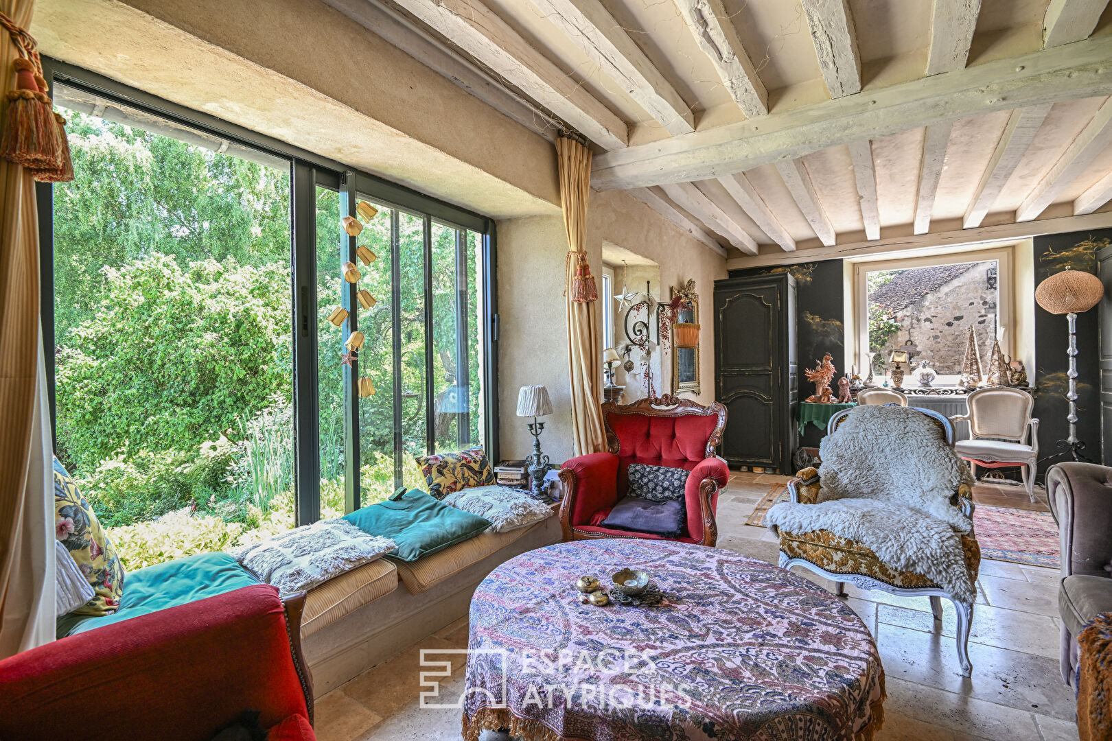 ... un salon avec des portes-fenêtres donnant sur le jardin.