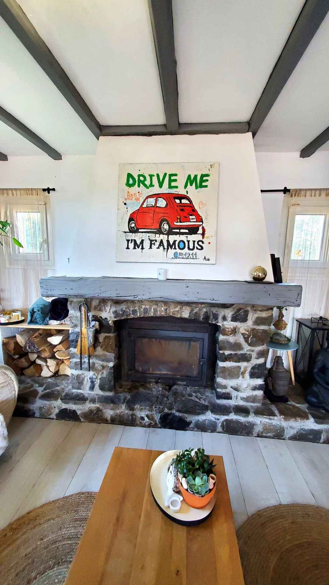 ...Grande pièce de vie lumineuse avec poutres apparantes et cheminée en pierres, accès à sa grande...