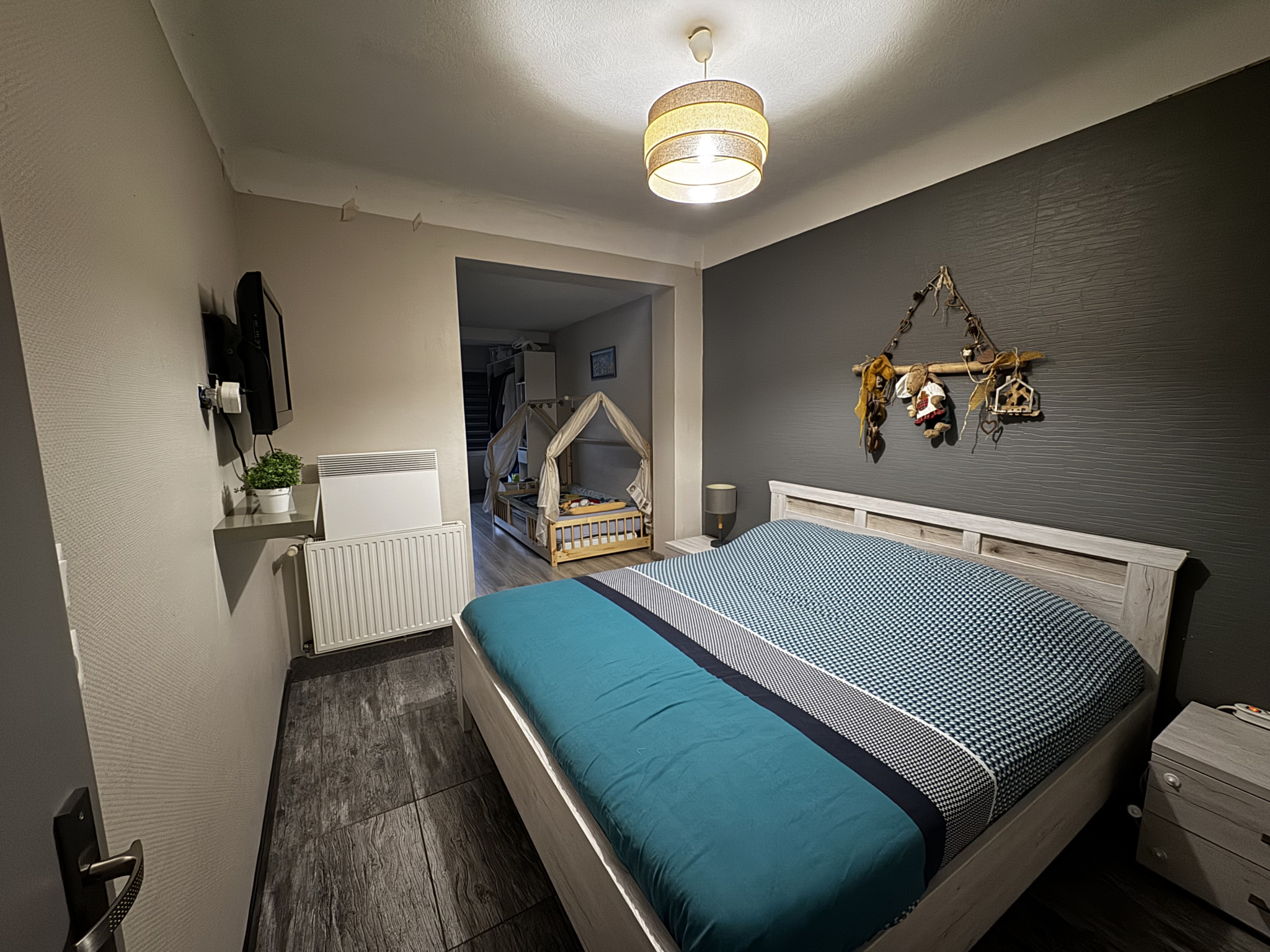 ...Au rez-de-chaussée, une entrée accueillante dessert une chambre avec un accès extérieur...
