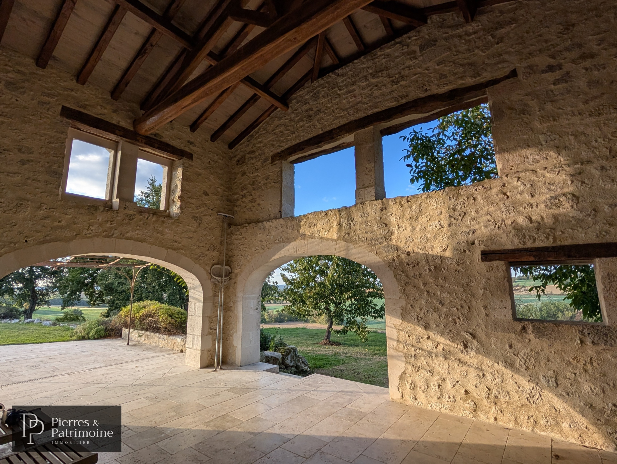 ... avec une vue panoramique sur les Pyrénées et les collines du Gers. Le bâtiment, construit en parpa...