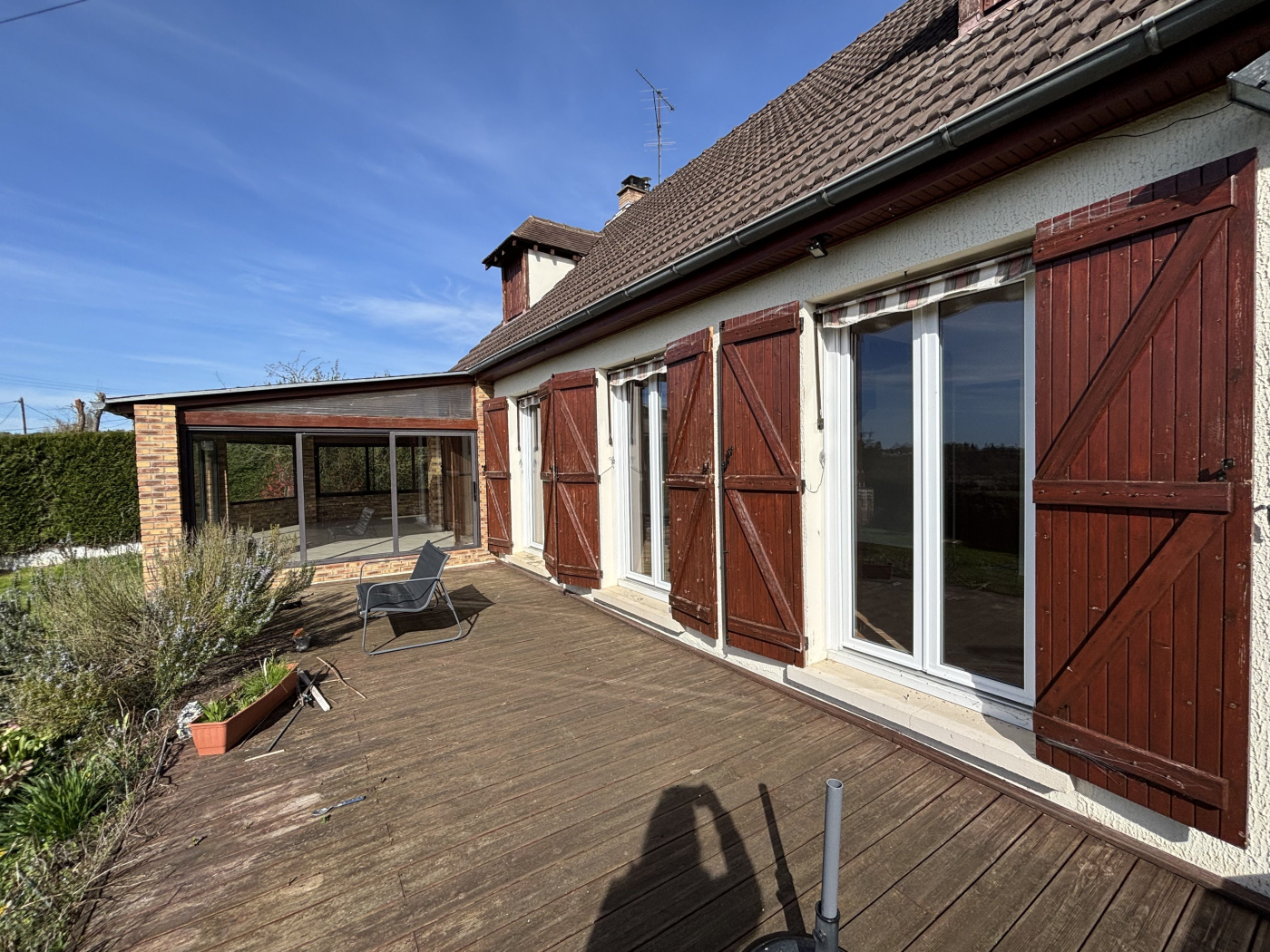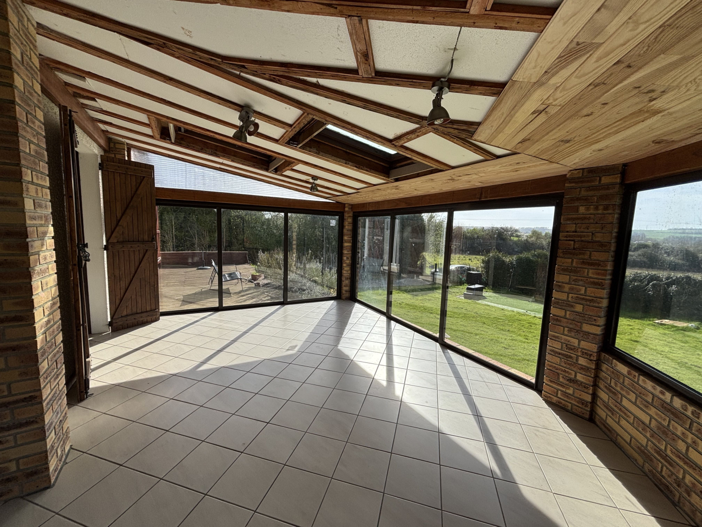 ... véranda, une cuisine équipée, un couloir desservant une grande chambre, une salle de bains et des w...