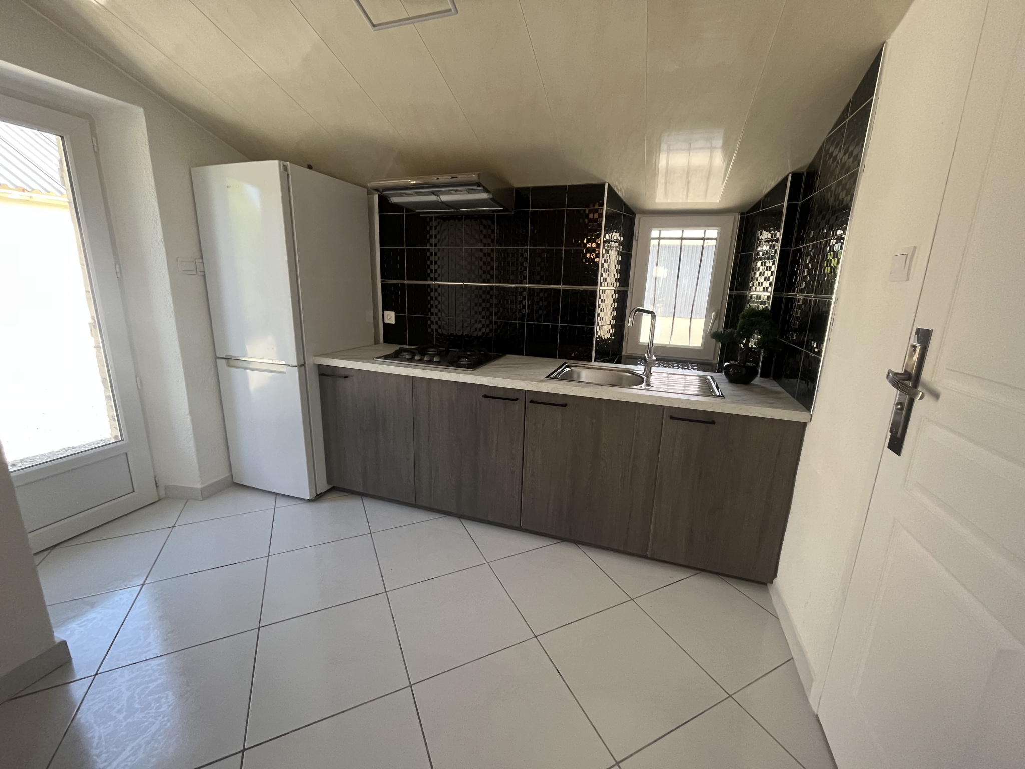 ...4 m² avec pièce de vie avec cuisine ouverte (et poêle à bois), une salle de bain avec wc, patio...