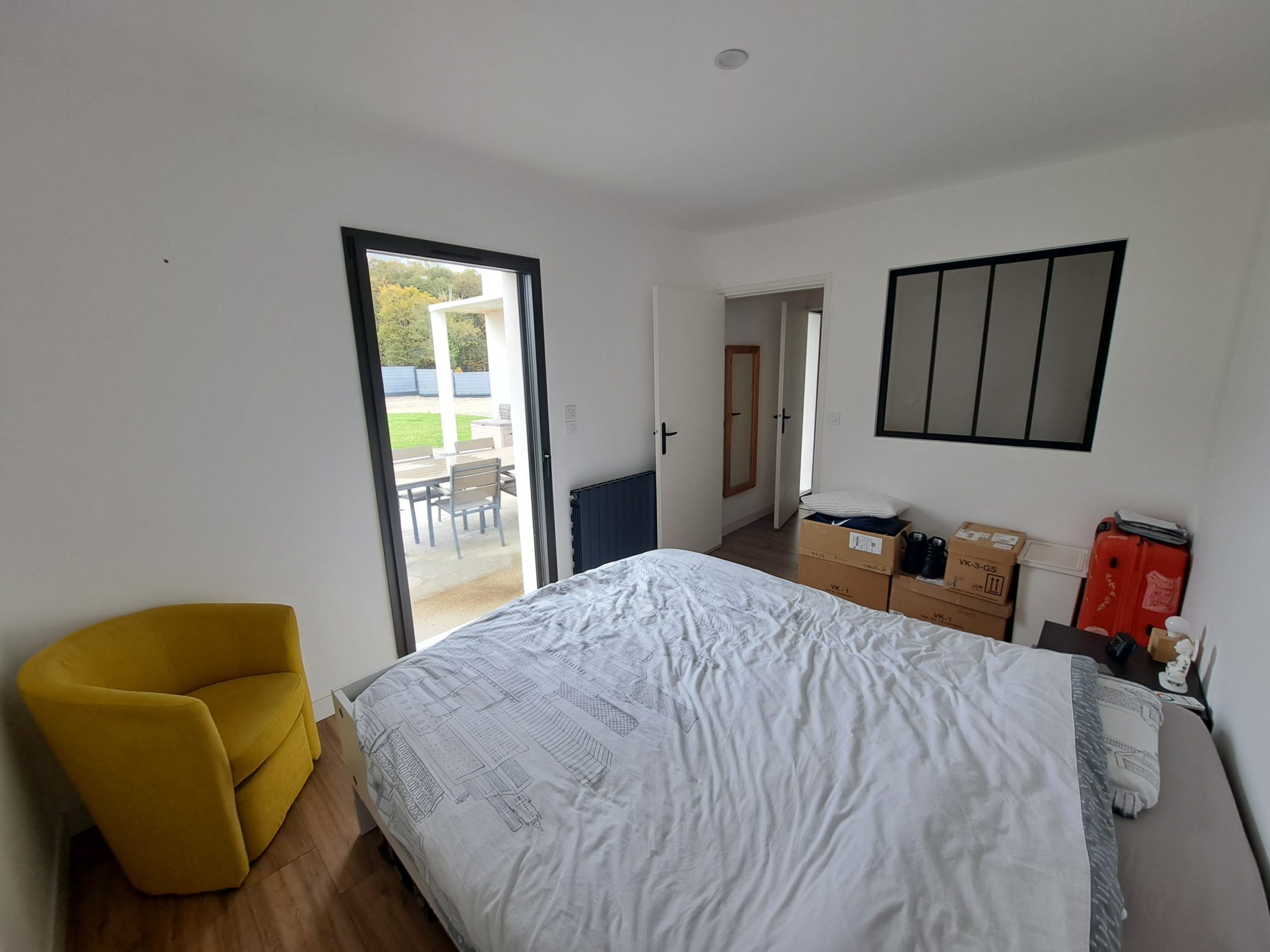 ...L'entrée sous préau ouvre sur un dégagement qui abrite les WC et accède à la pièce de vie...