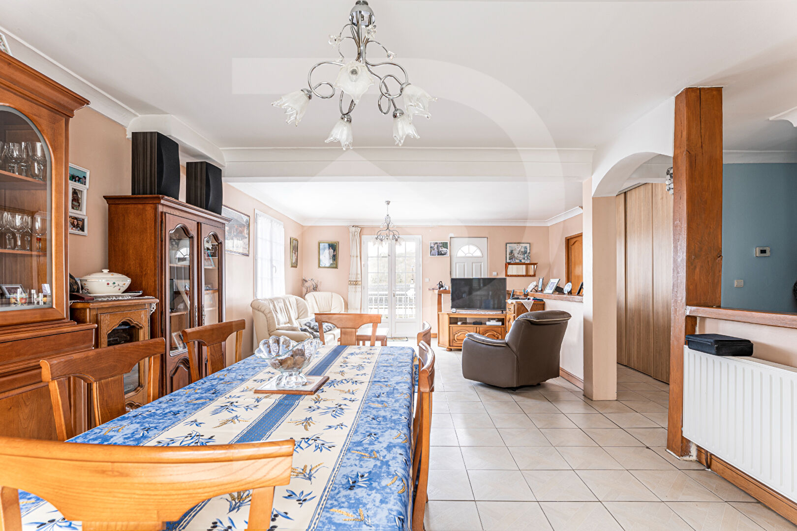 ... séjour salon lumineux ouvert sur la cuisine .