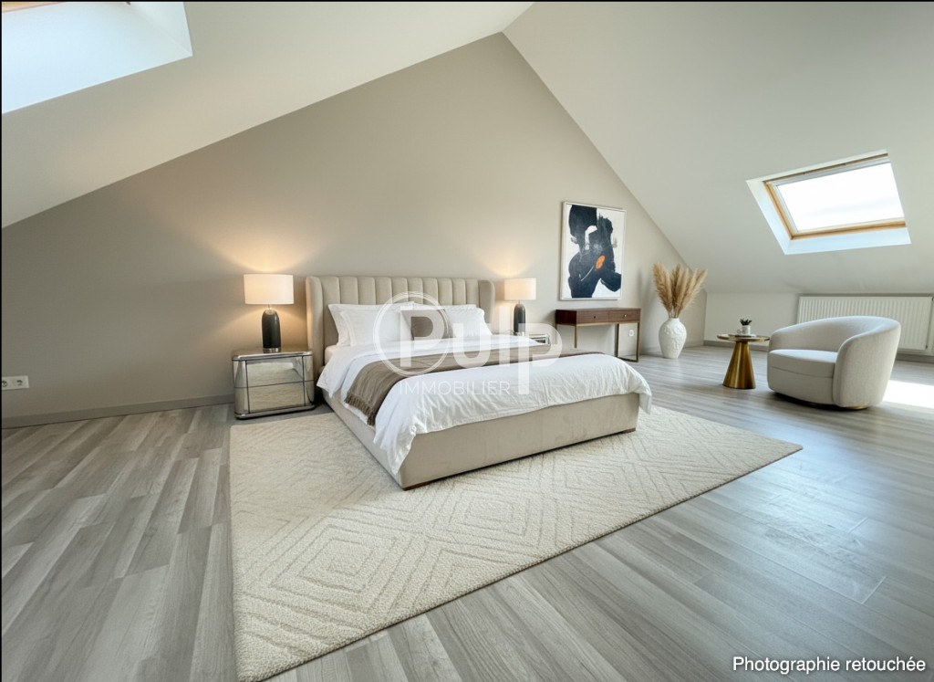 ... accès à une cuisine équipée. À l'étage, un palier desservant 2 chambres et les combles aménageables...