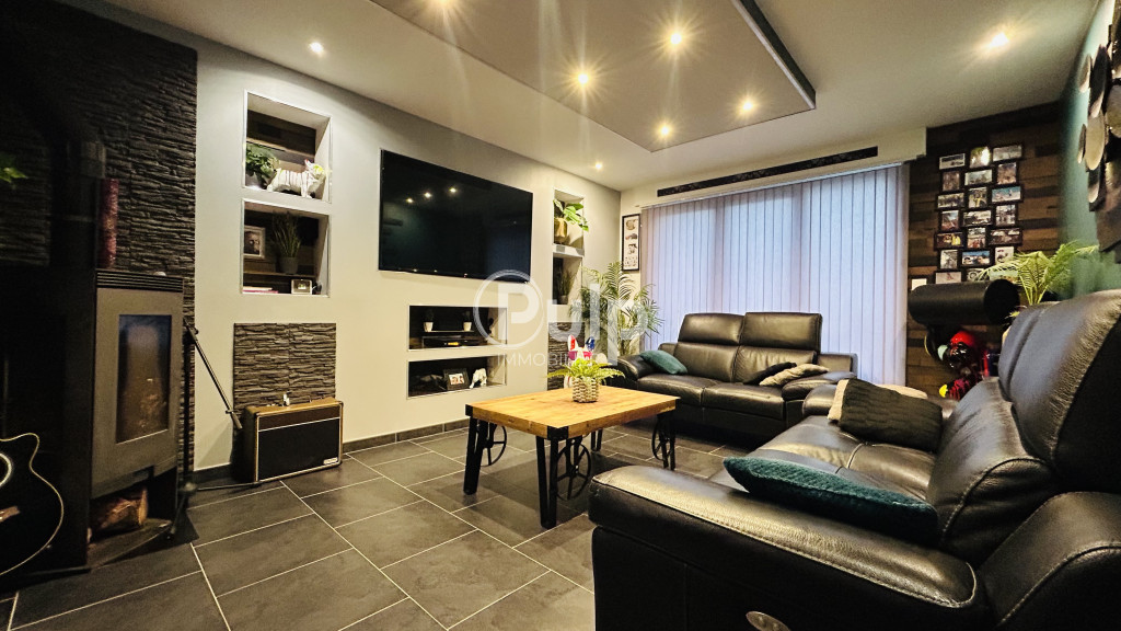 ...Au rez-de-chaussée, vous profitez d'une belle pièce de vie lumineuse avec poêle à pellets, d'une...
