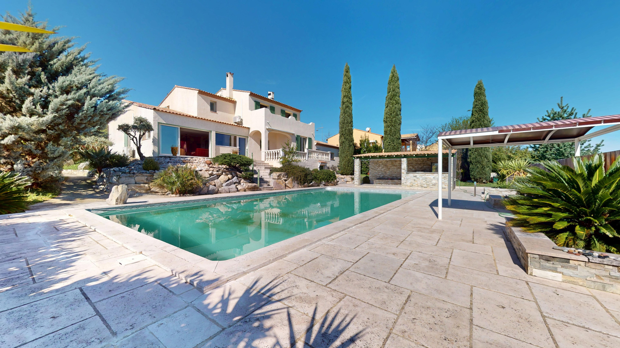 ... le terrain arboré de 967 m2 offre un cadre de vie privilégié avec une piscine de 12 x 6 mètres acco...
