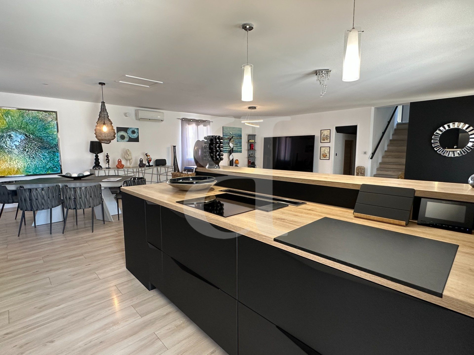 ... à manger et la cuisine équipée design, créant un espace de vie convivial et élégant.