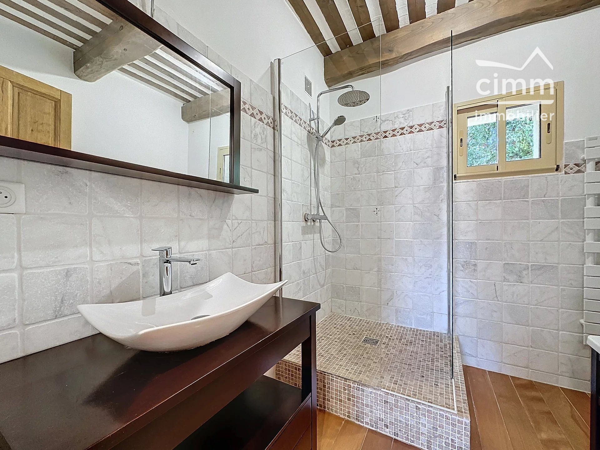 ...Au rez-de-chaussée, vous découvrirez un salon lumineux avec des pierres apparentes, créant une...