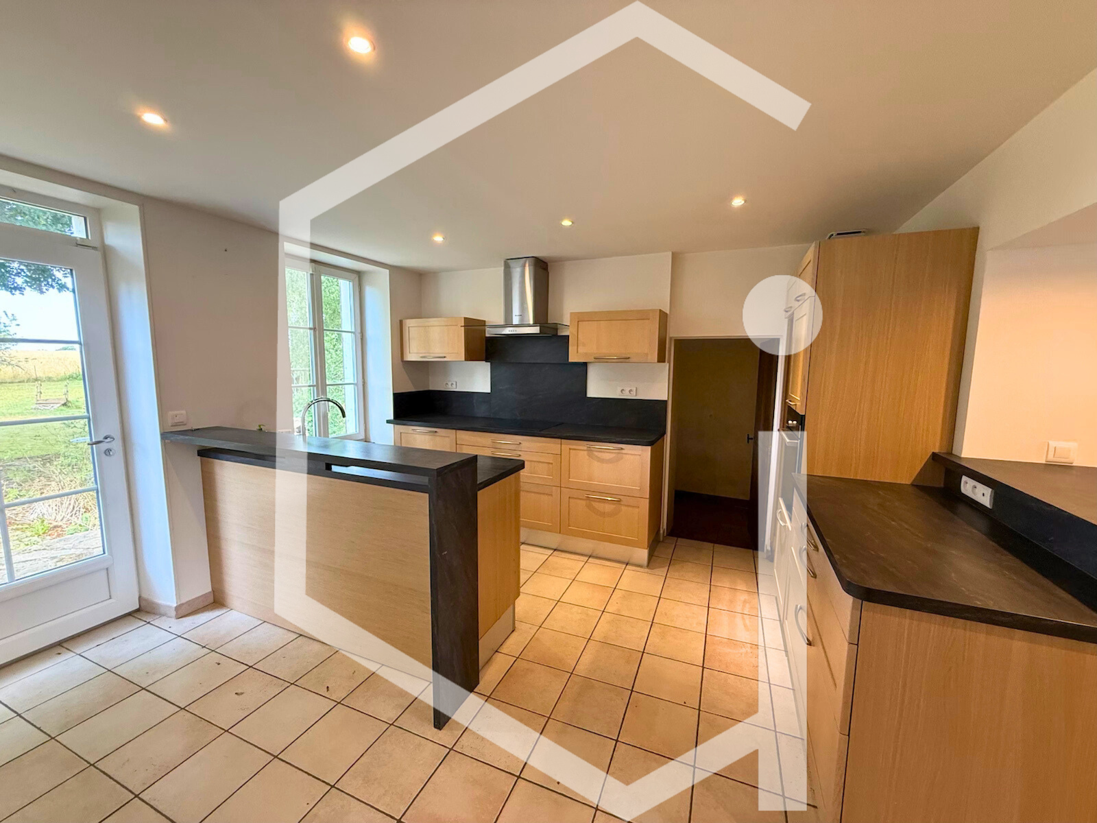 ...A droite une cuisine aménagée et équipée ouverte sur un salon - séjour de 23 m2 avec baie vitrée...