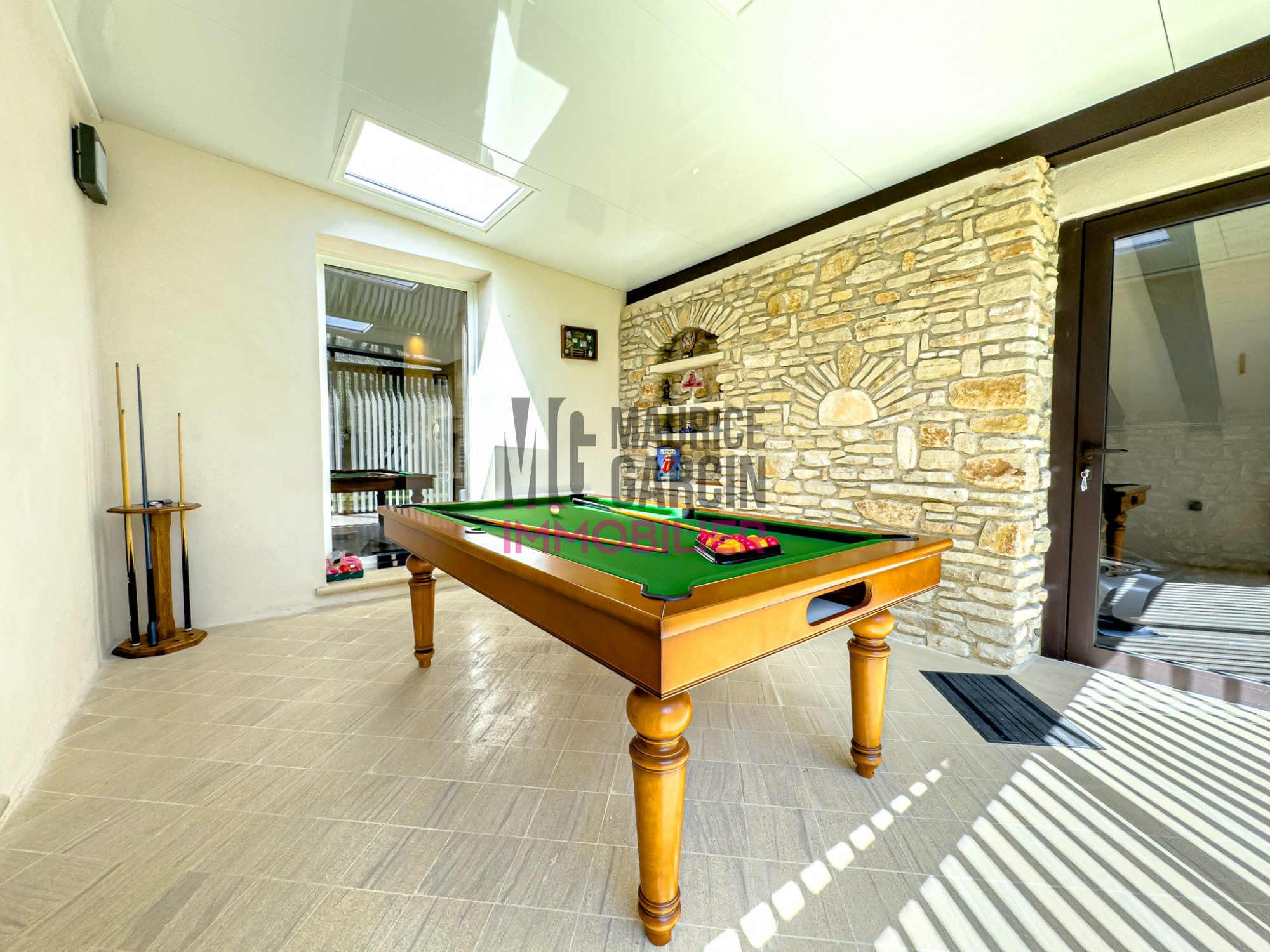 ...Sa grande terrasse de plus de 30 m² avec tonnelle ouverte sur jardin avec piscine...