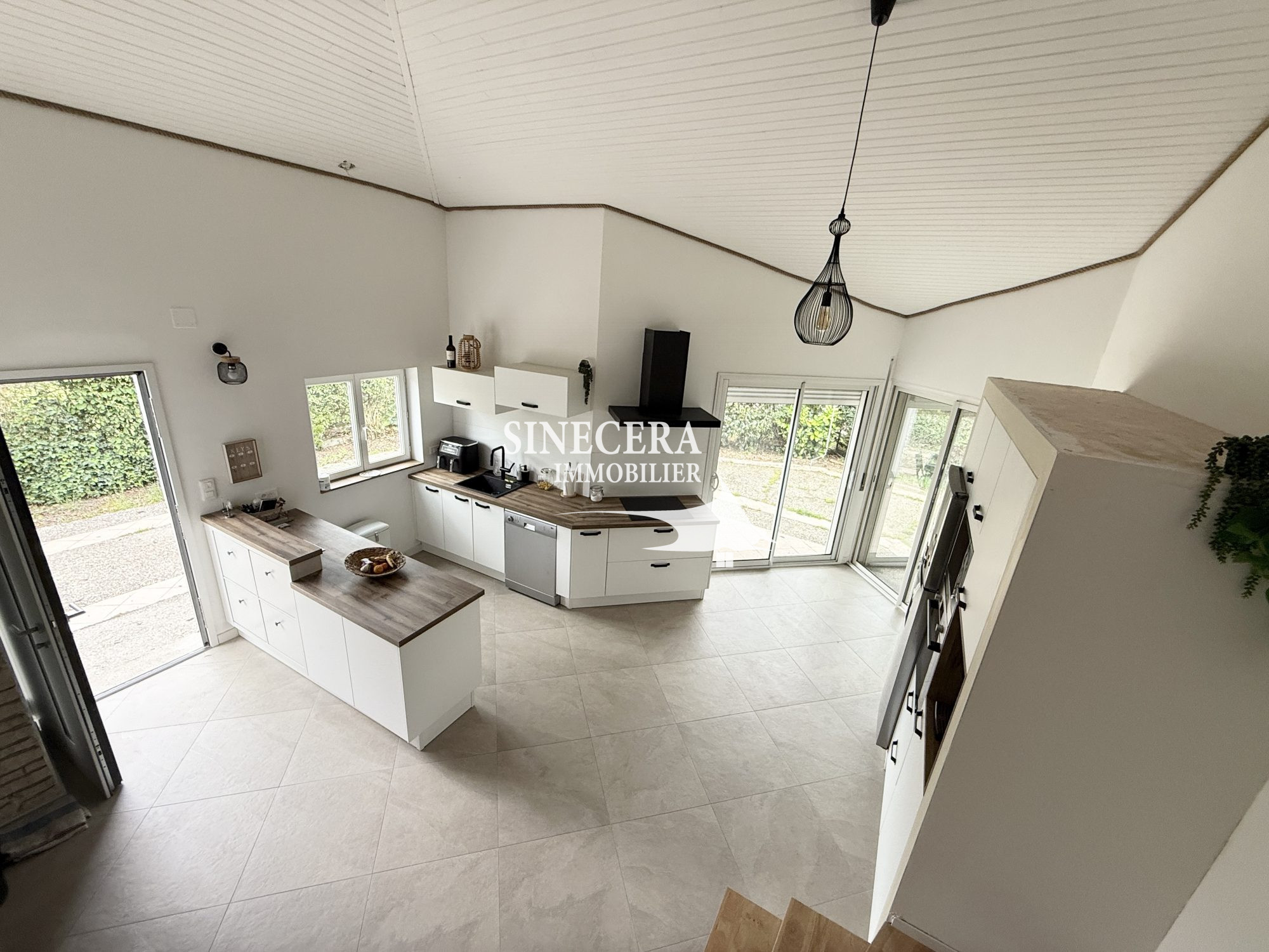 ...Une cuisine américaine équipée ouverte sur la pièce de vie avec salon salle à manger vue sur la...