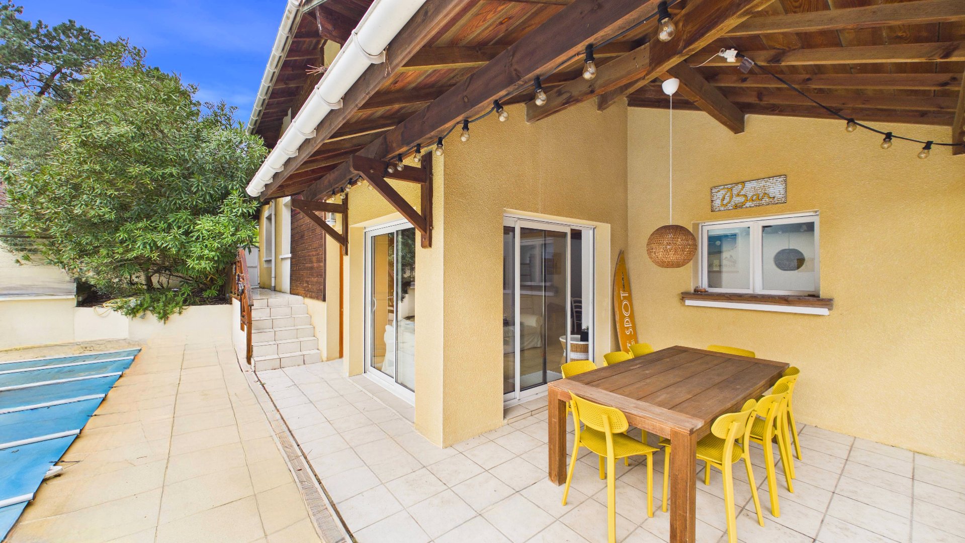 ...La pièce de vie d'environ 60m2 est ouverte sur la terrasse couverte d'environ 54m2...