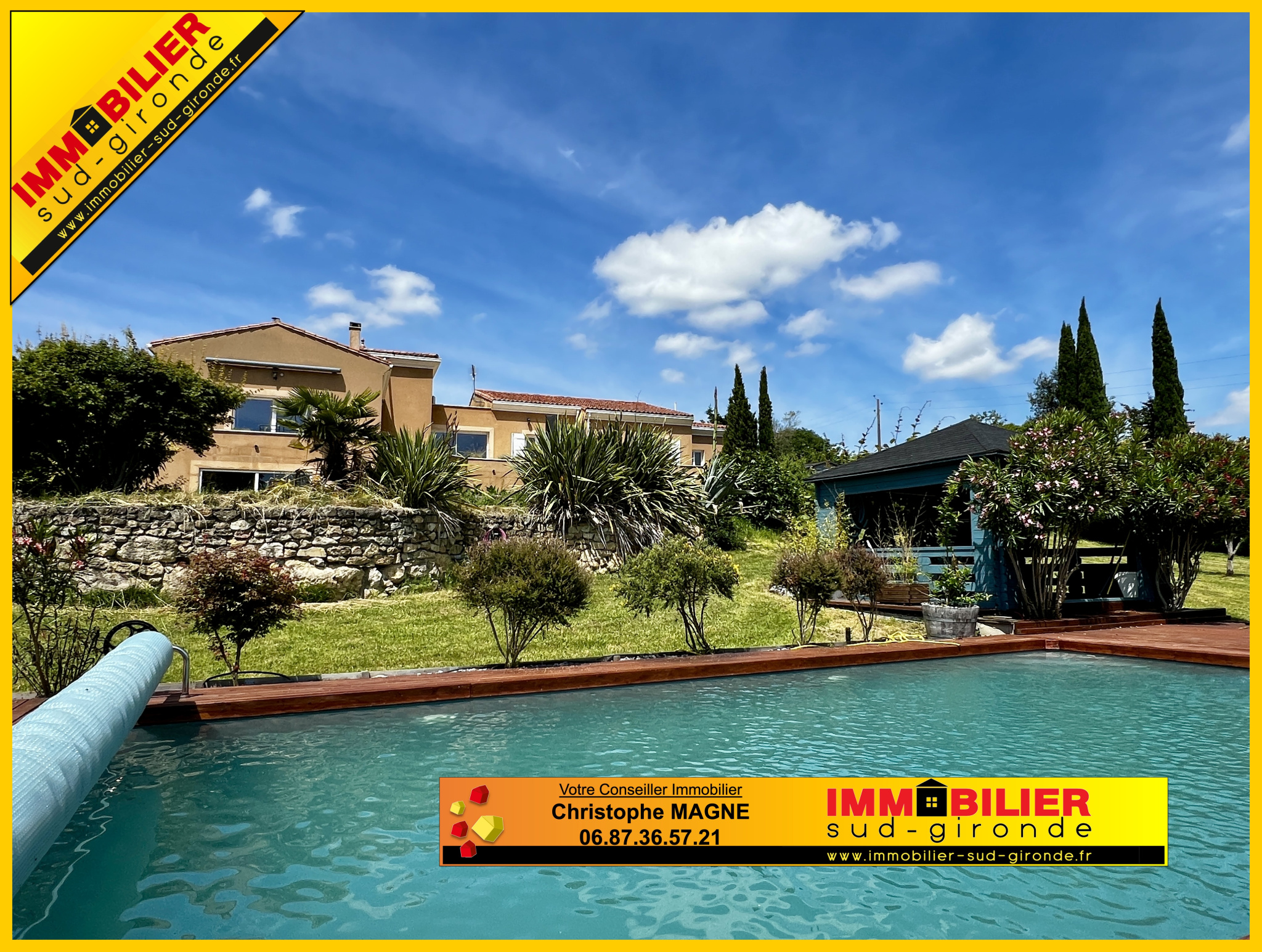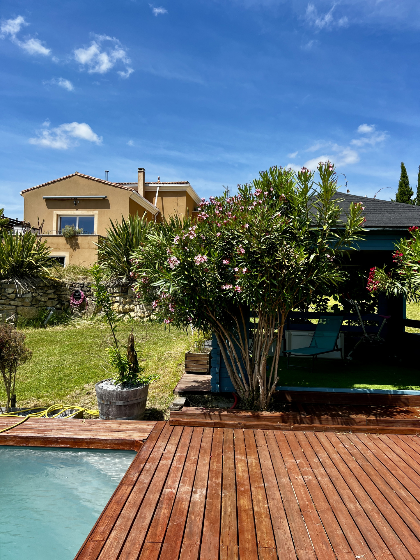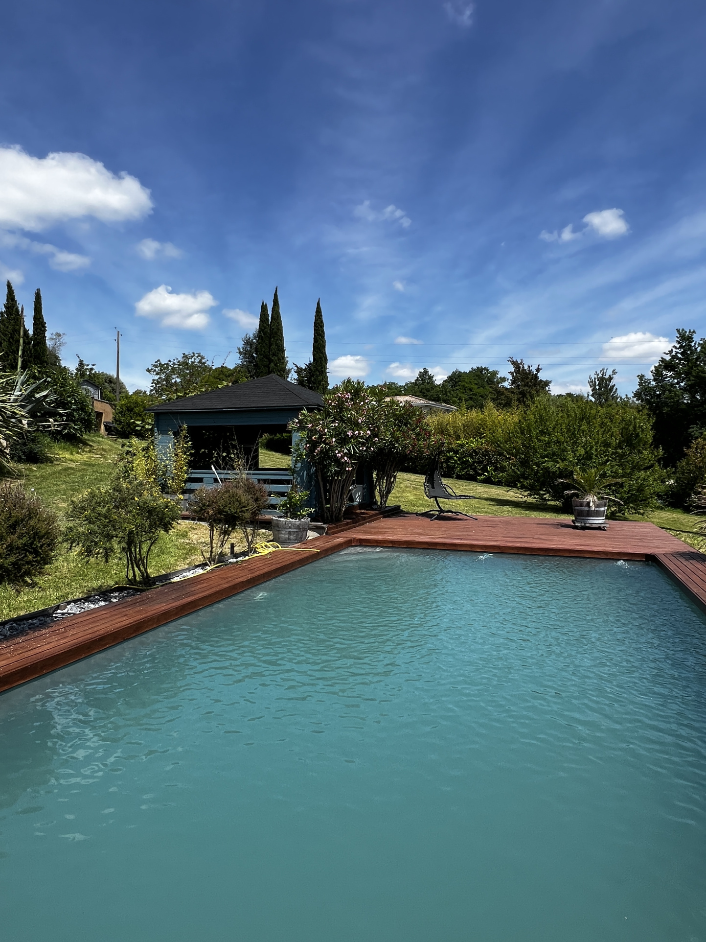 ...Terrasses avec store-ban, piscine avec terrasse et gazebo...
