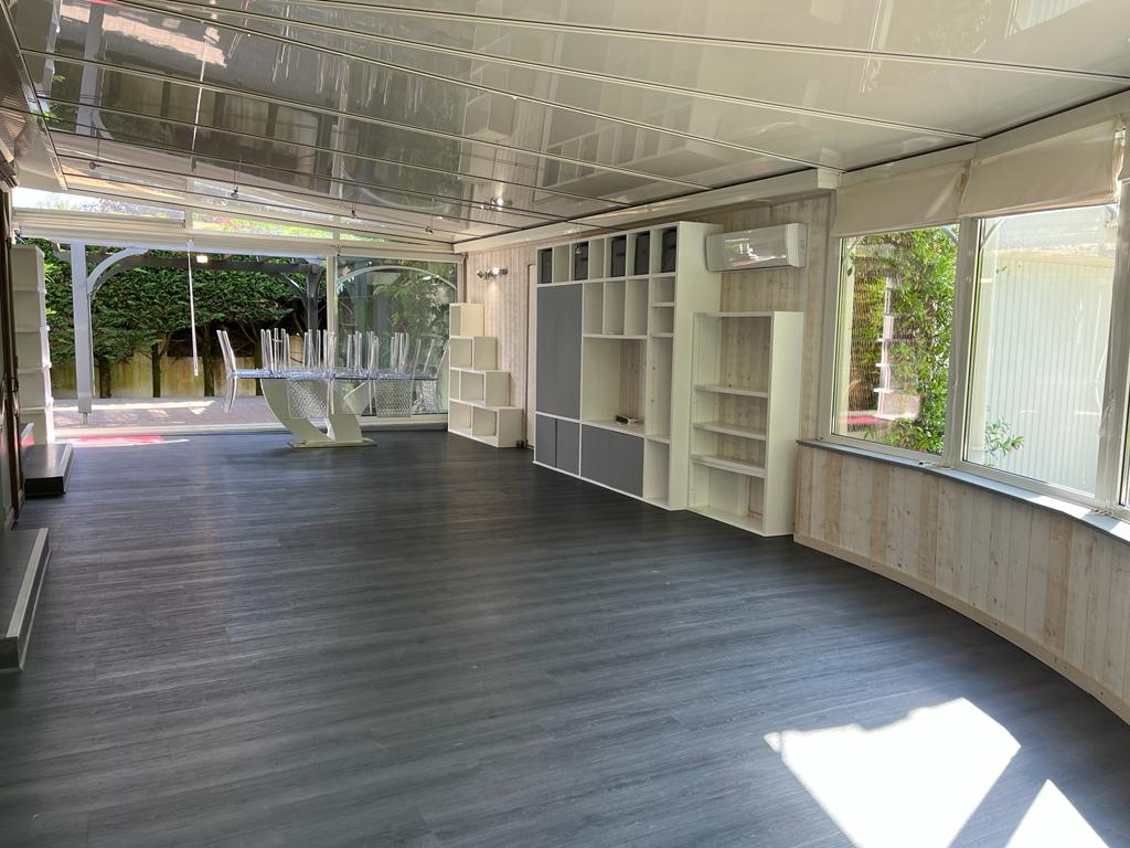 ...En plus de son vaste jardin, la villa dispose d'un spa de nage, d'une terrasse en bois...