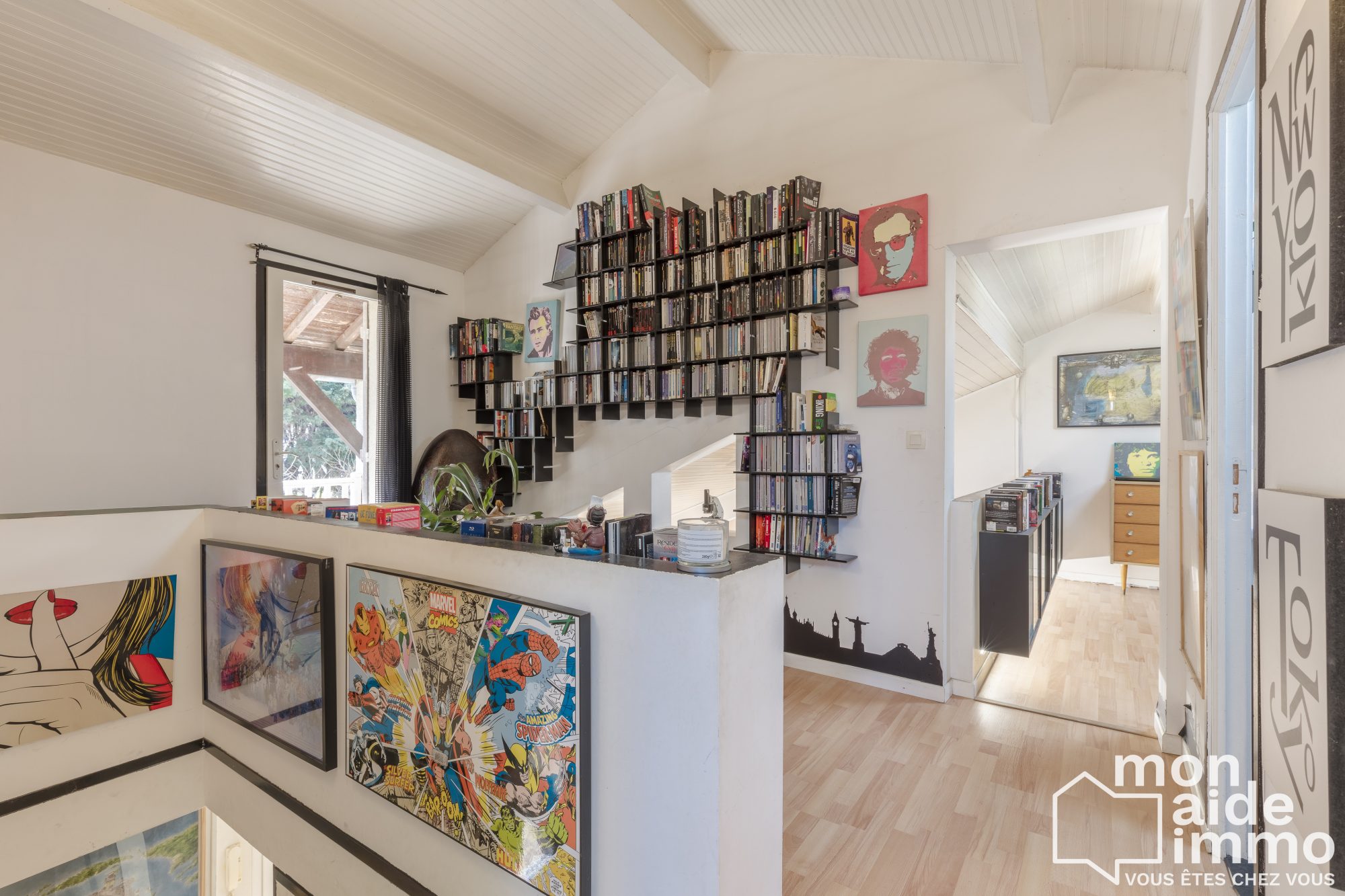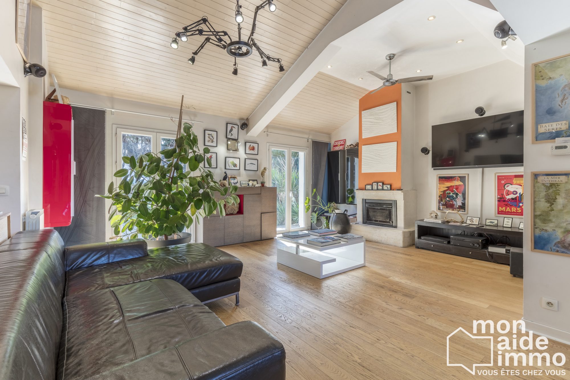 ...Dès l'entrée, les murs en pierre apparente donnent le ton et mènent à un vaste séjour de 65 m²...