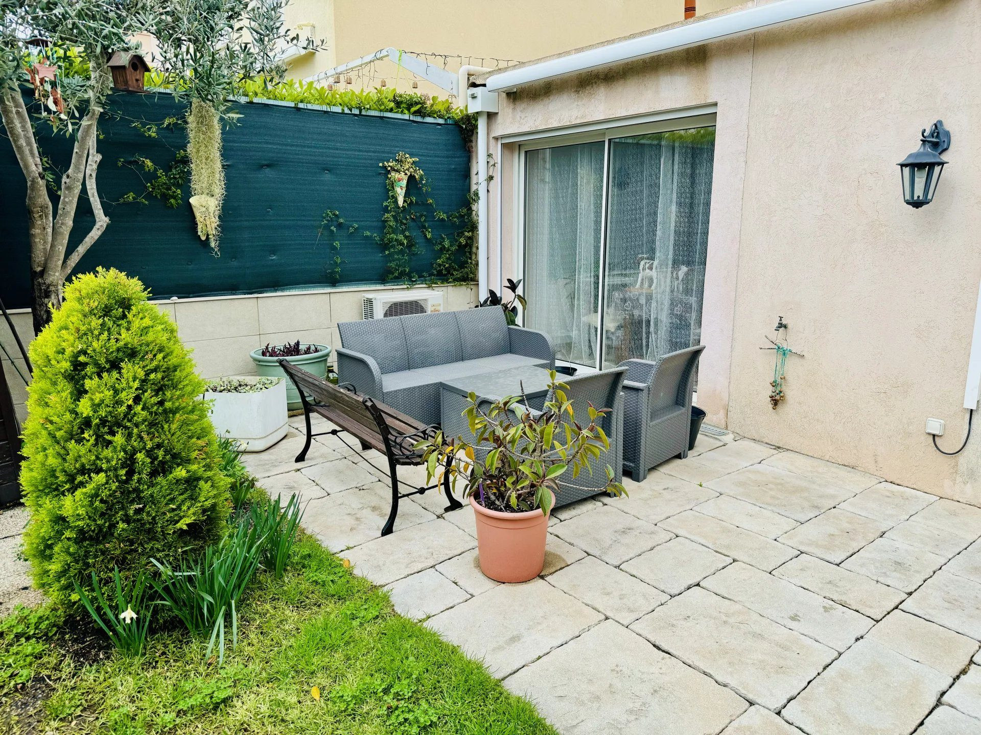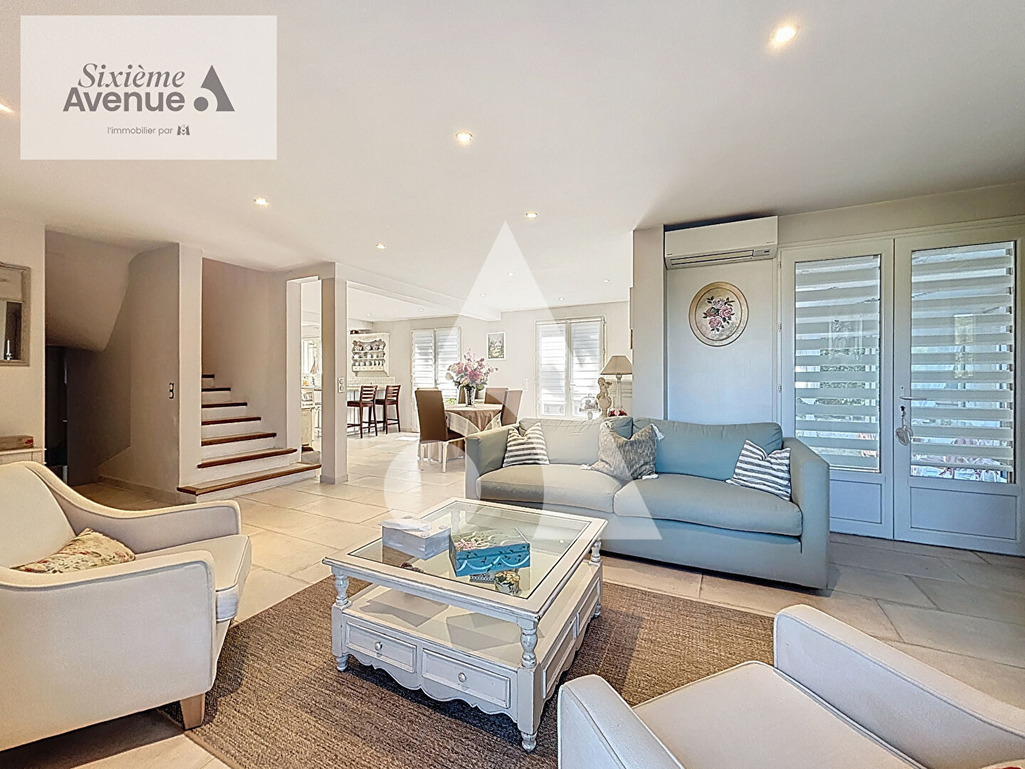 ...Au rez-de chaussée large pièce de vie donnant sur sa terrasse ensoleillée, salon d'été, cuisine...