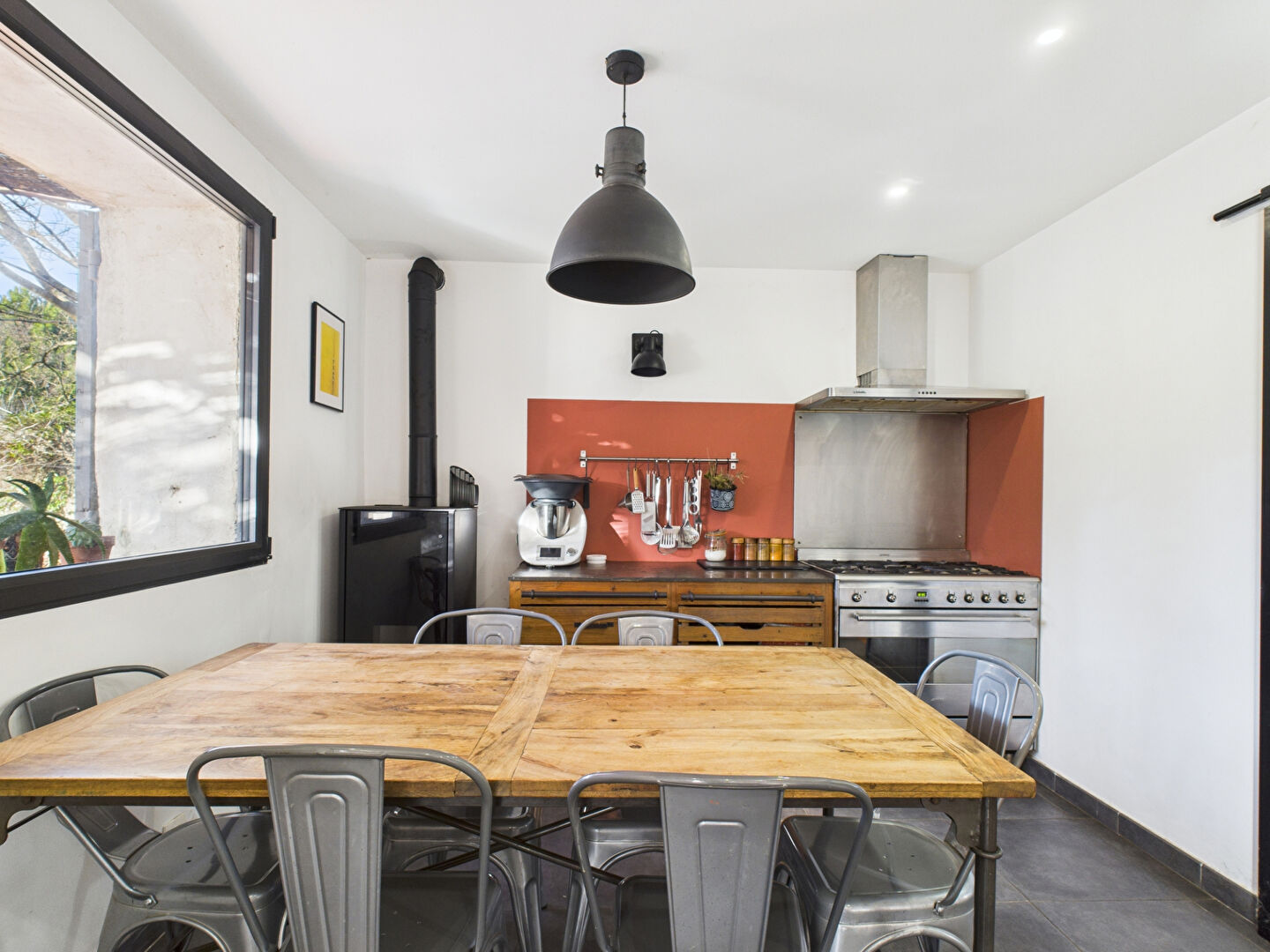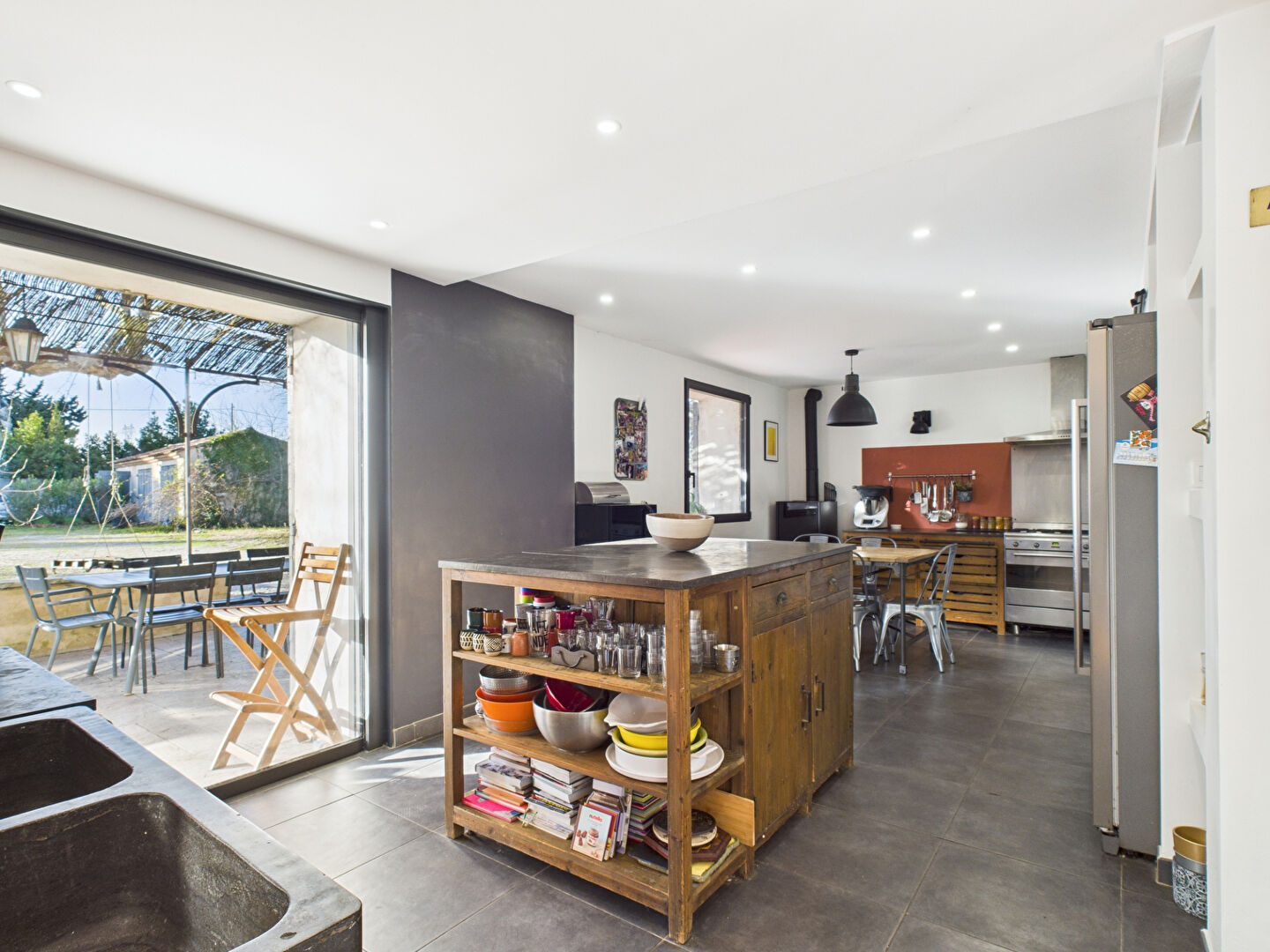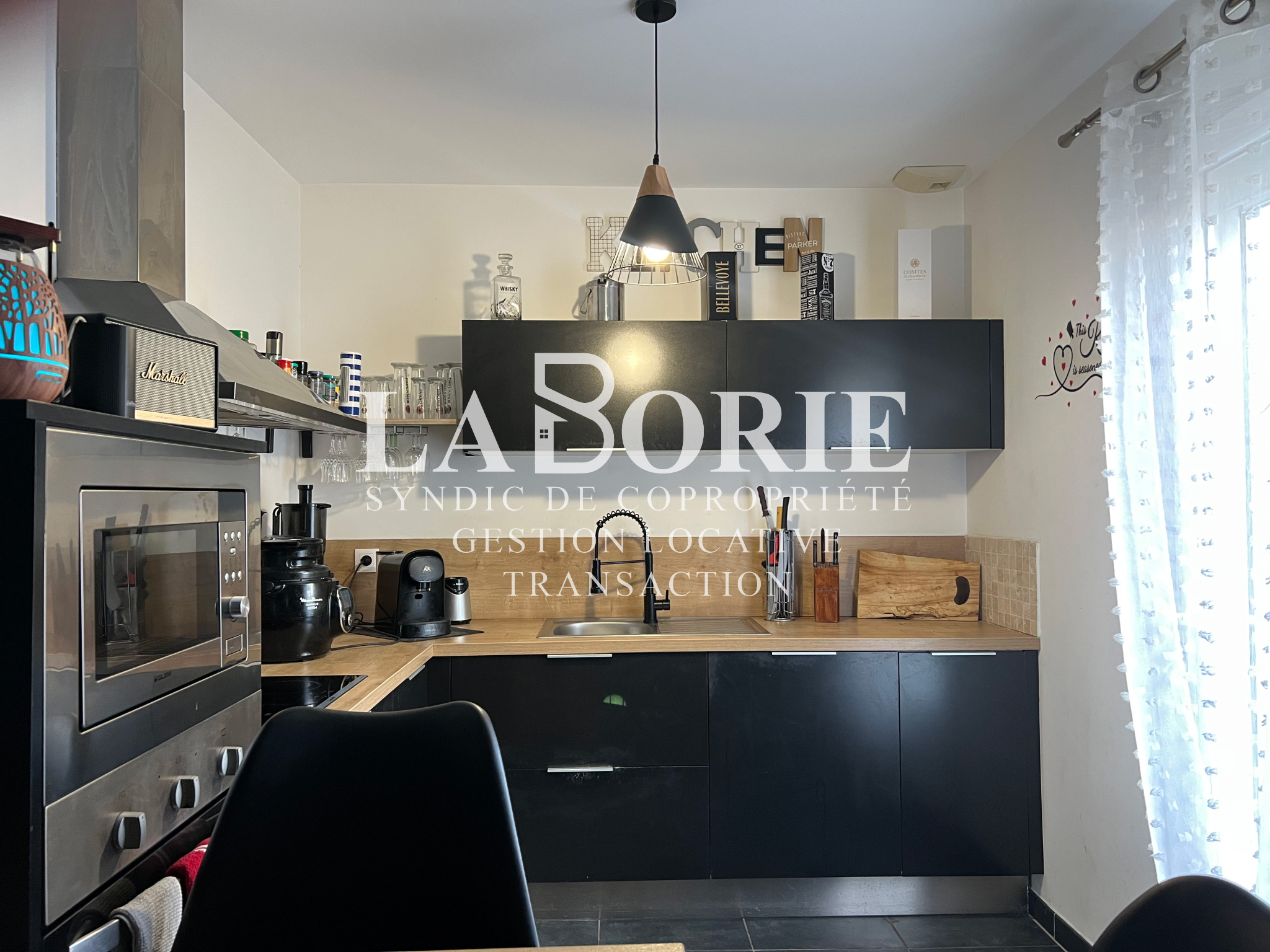 ...La cuisine, aménagée et équipée, offre de vastes plans de travail, et s'ouvre sur le salon/salle...