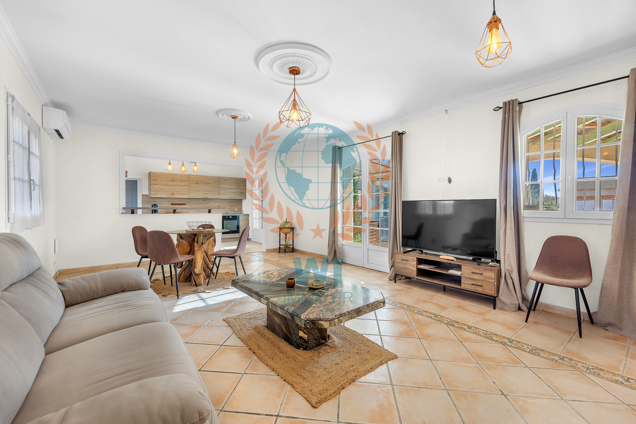 ...Au 1o étage, superbe salon lumineux de 45 m2 avec cheminée insert, son coin bar et son espace...