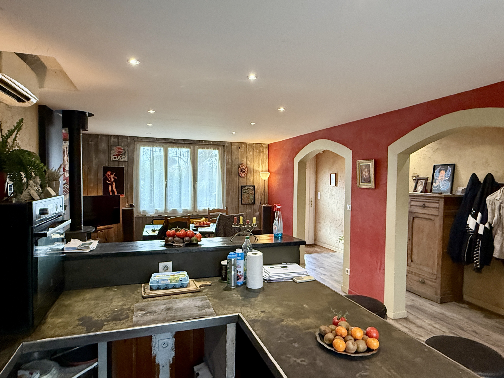 ...Sa cuisine indépendante toute équipée , son salon avec poêle à bois ouvert sur une large baie...