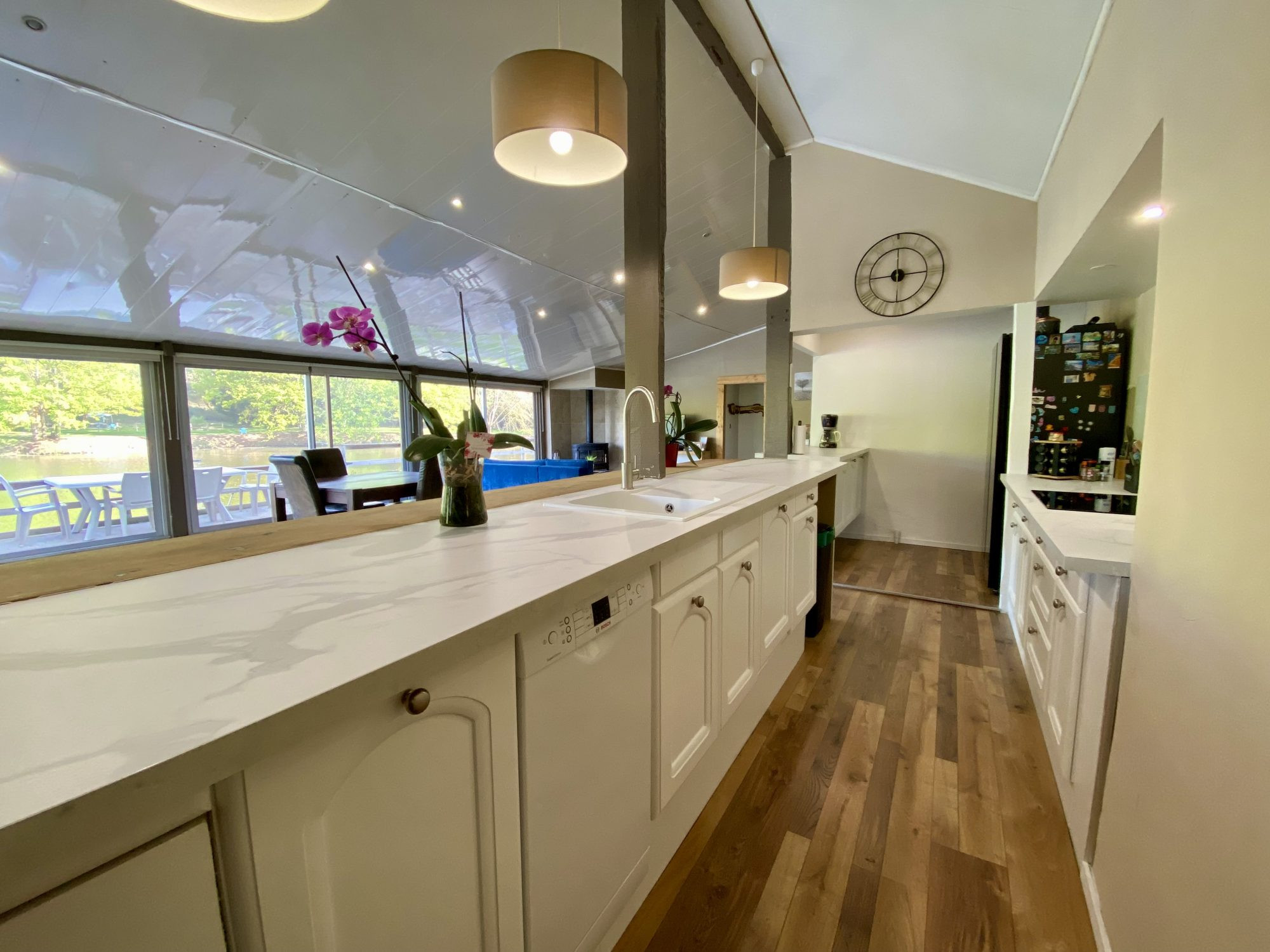 ...Une cuisine conviviale ouverte sur un salon-séjour avec de grandes verrières donnant sur la...