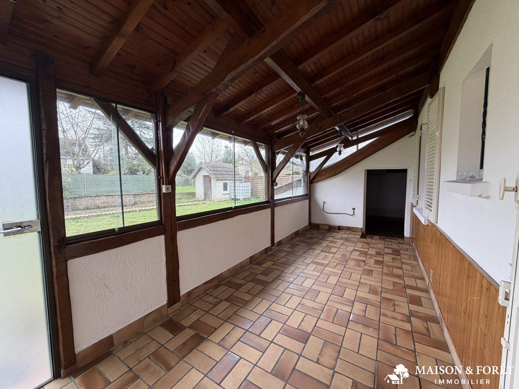 ...Entrée sous un porche, cuisine aménagée, salon - salle à manger avec cheminée insert ouvert sur...
