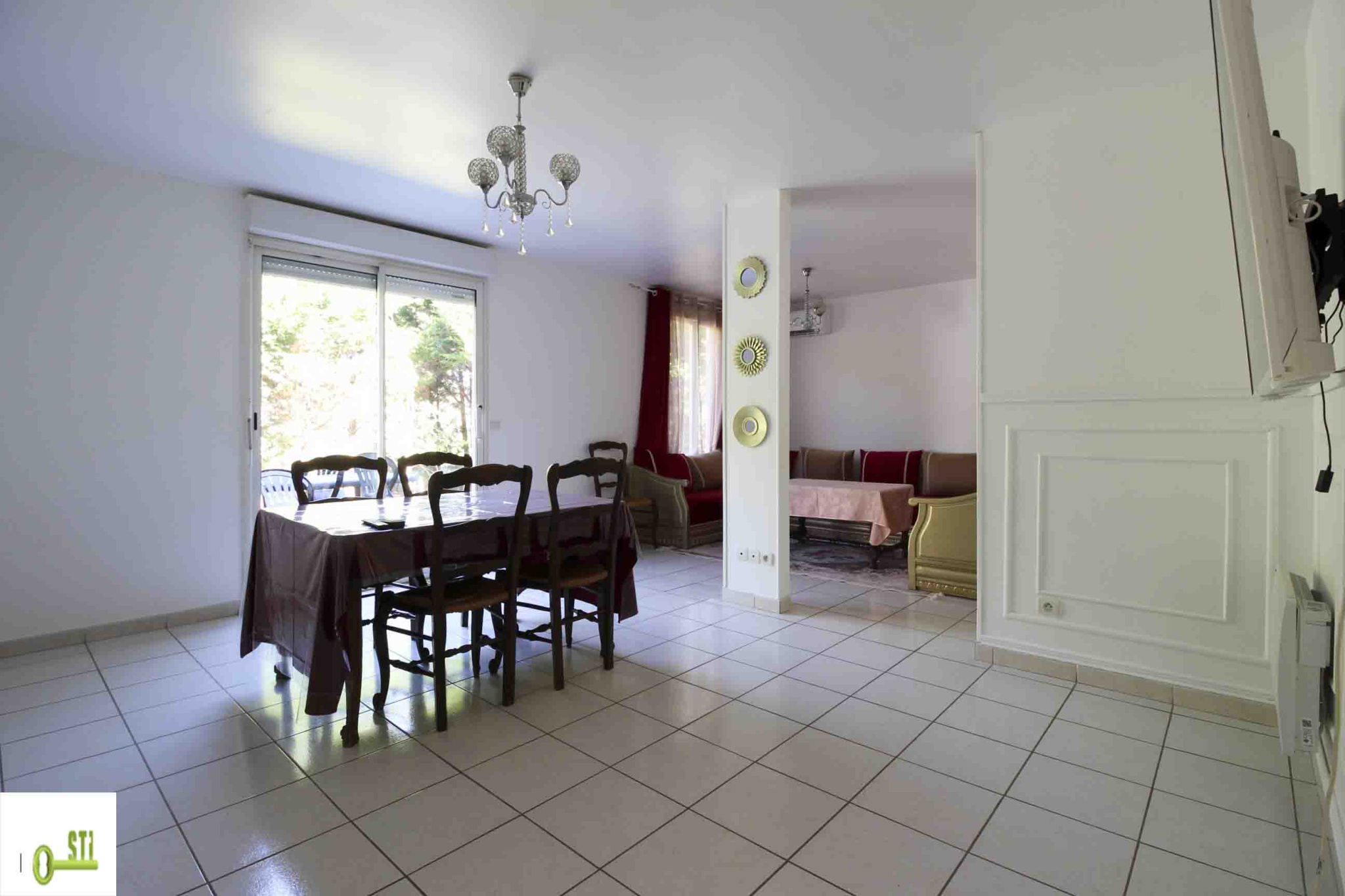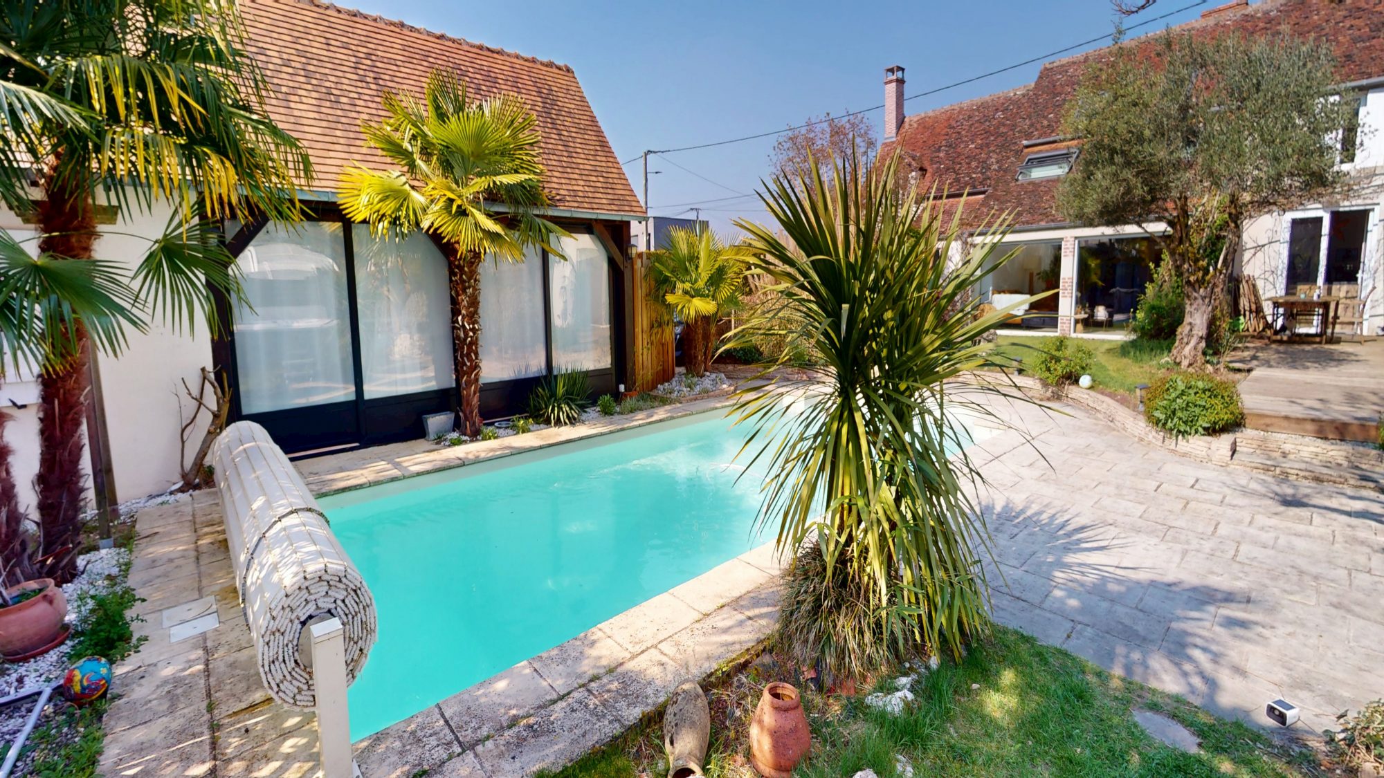 ...Terrasse carrelée d'environ 40 m2 équipée d'un store banne électrique et d'une piscine creusée...