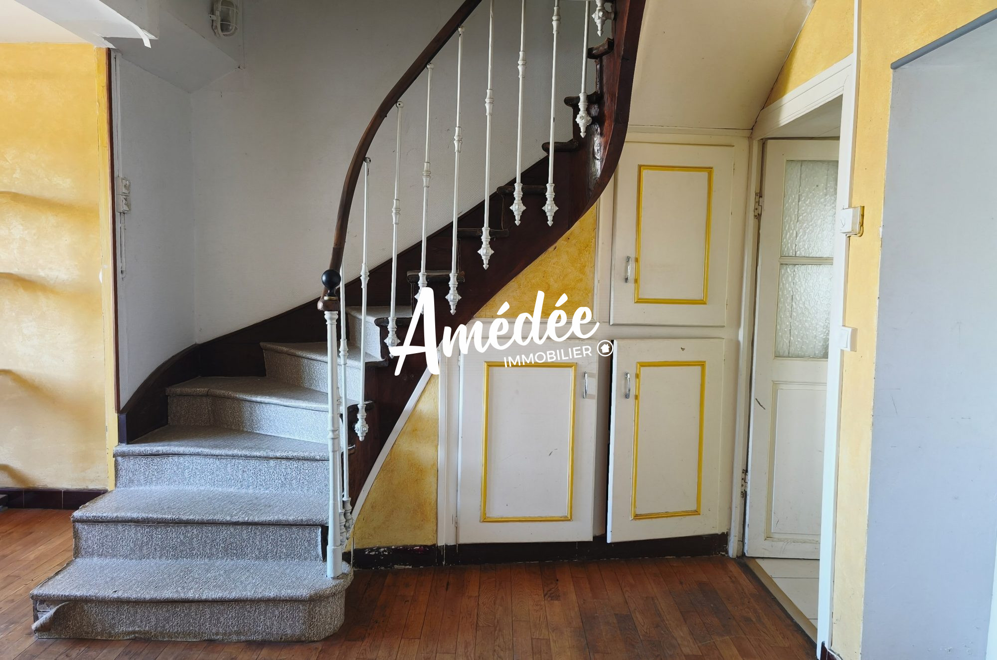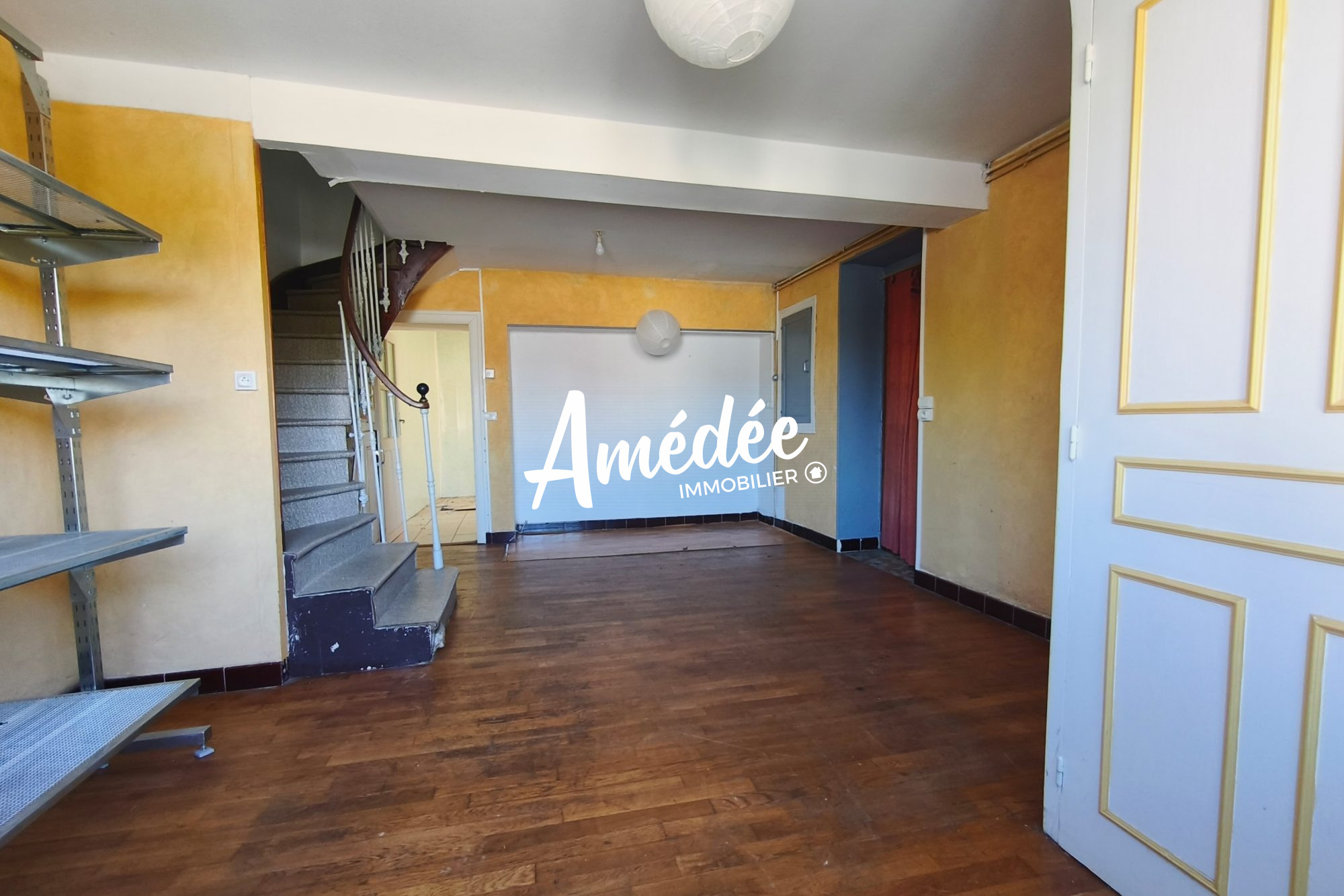 ...Au rez-de-chaussée : salle à manger et cuisine séparées par une cloison simple, chambre, salle...