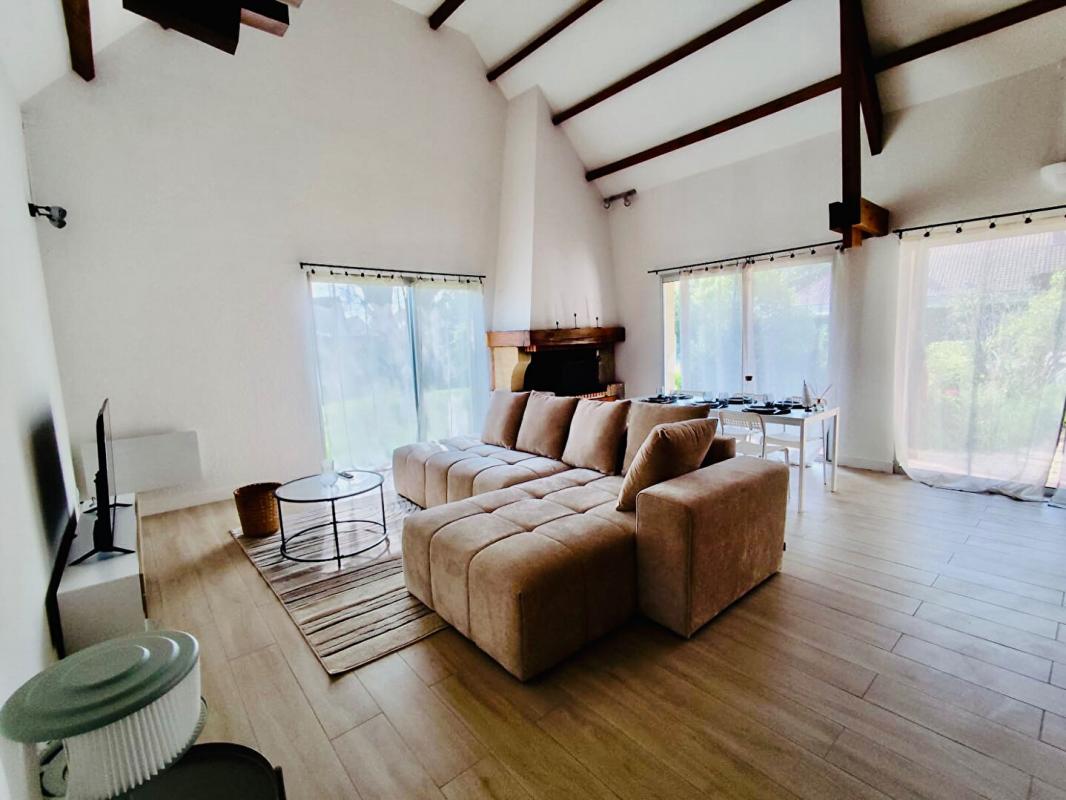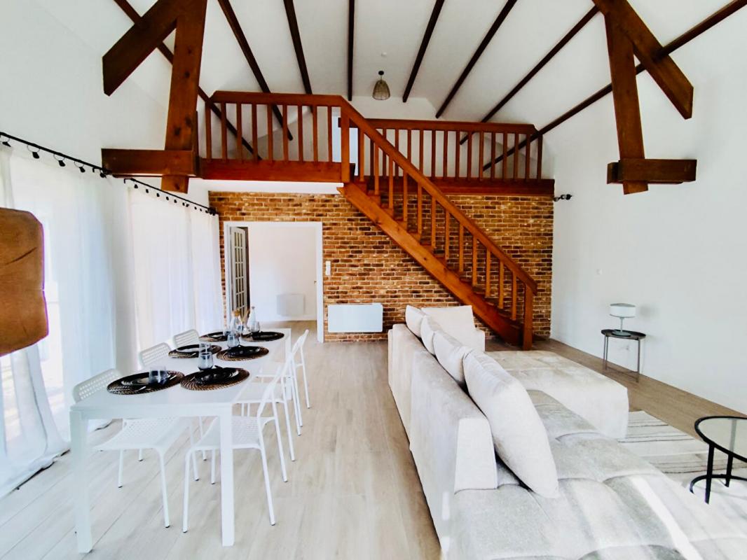 ... vie de 46 m2 avec cuisine équipée ouverte, poêle à bois et larges baies vitrées donnant sur une ter...