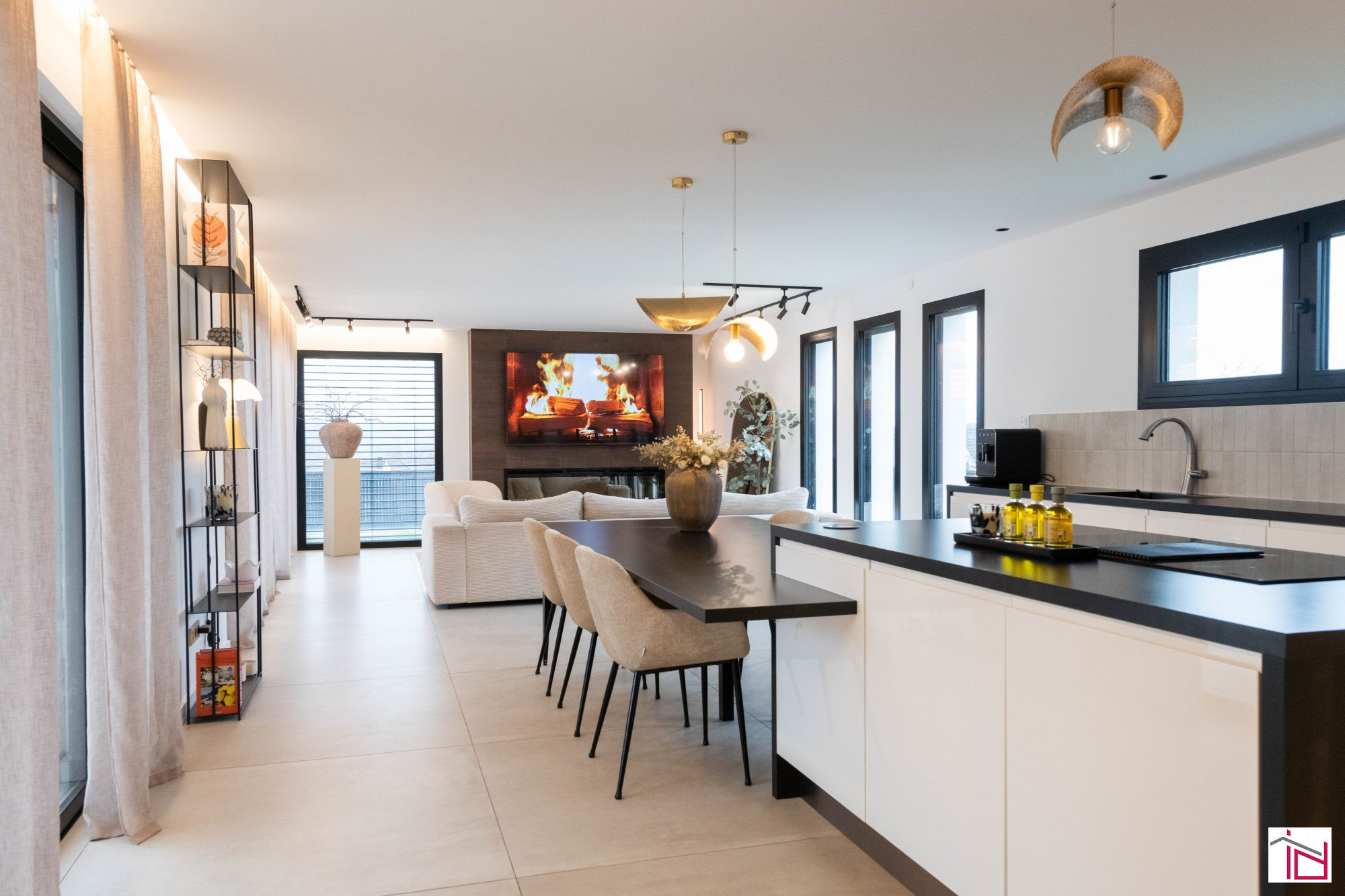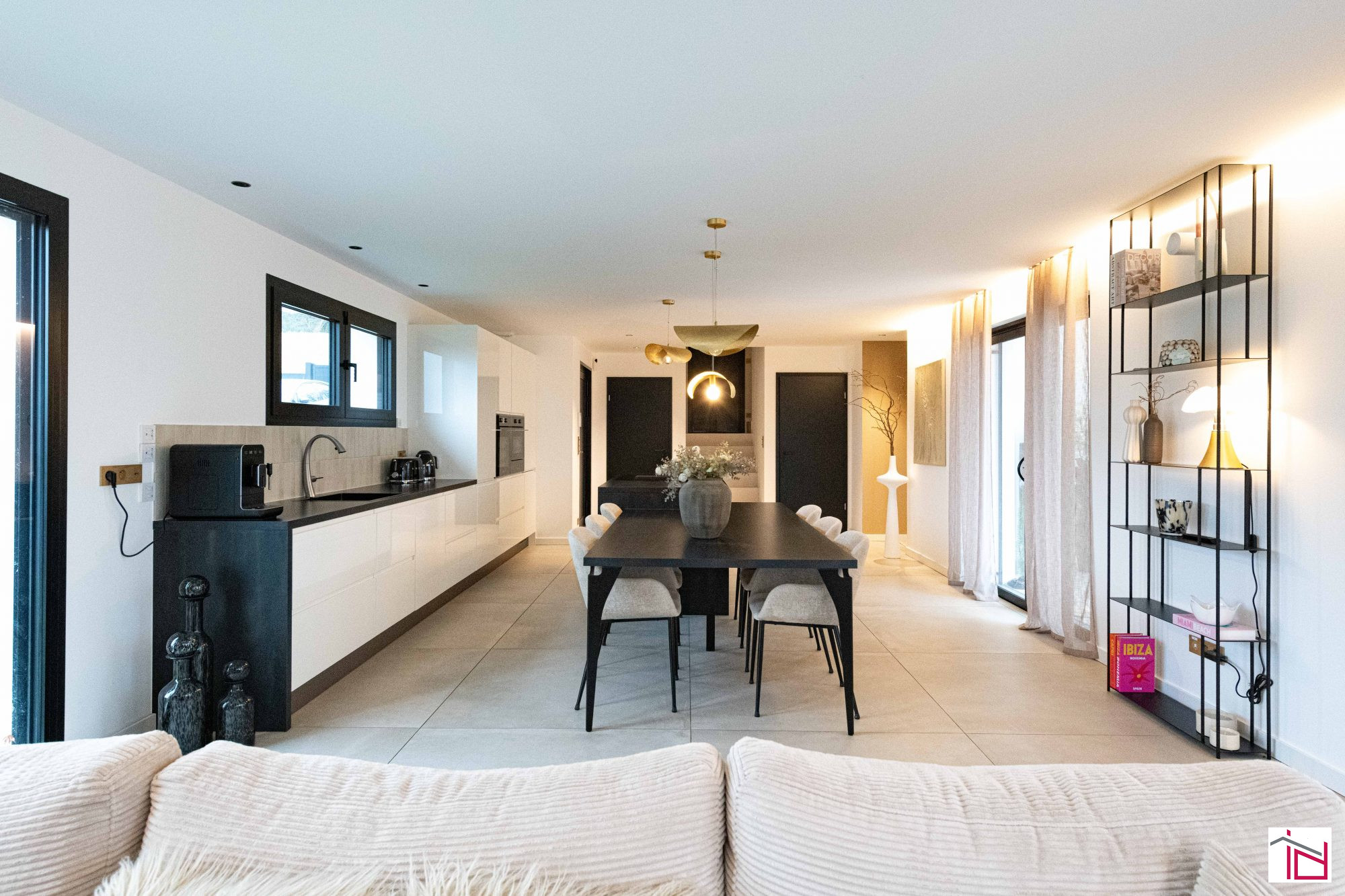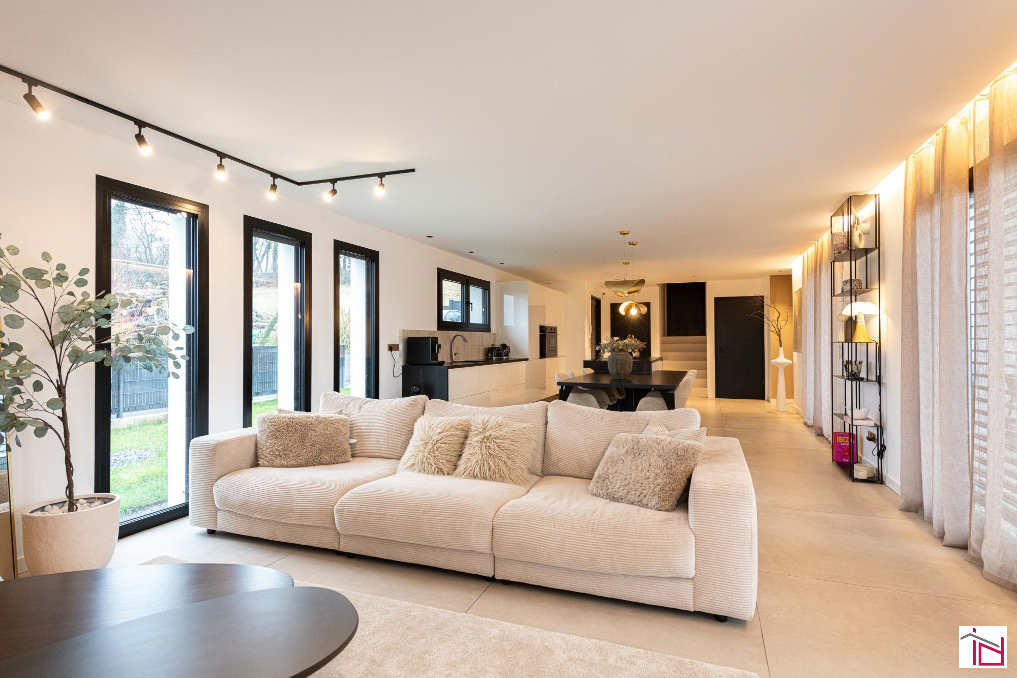 ...La pièce de vie, véritable espace de réception, développe 55 m² et offre une atmosphère lumineuse...
