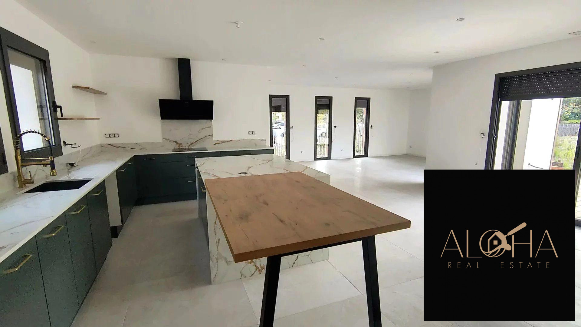...Salon séjour ouvert sur la nature, cuisine ouverte aménagée et équipée avec îlot central,...