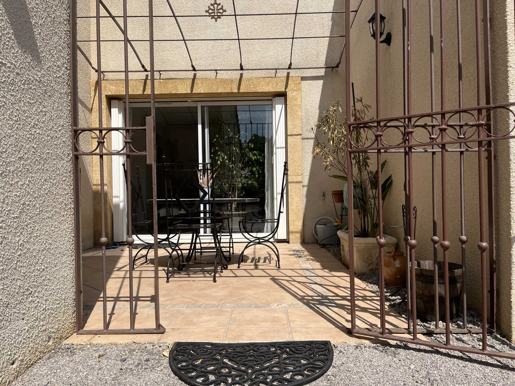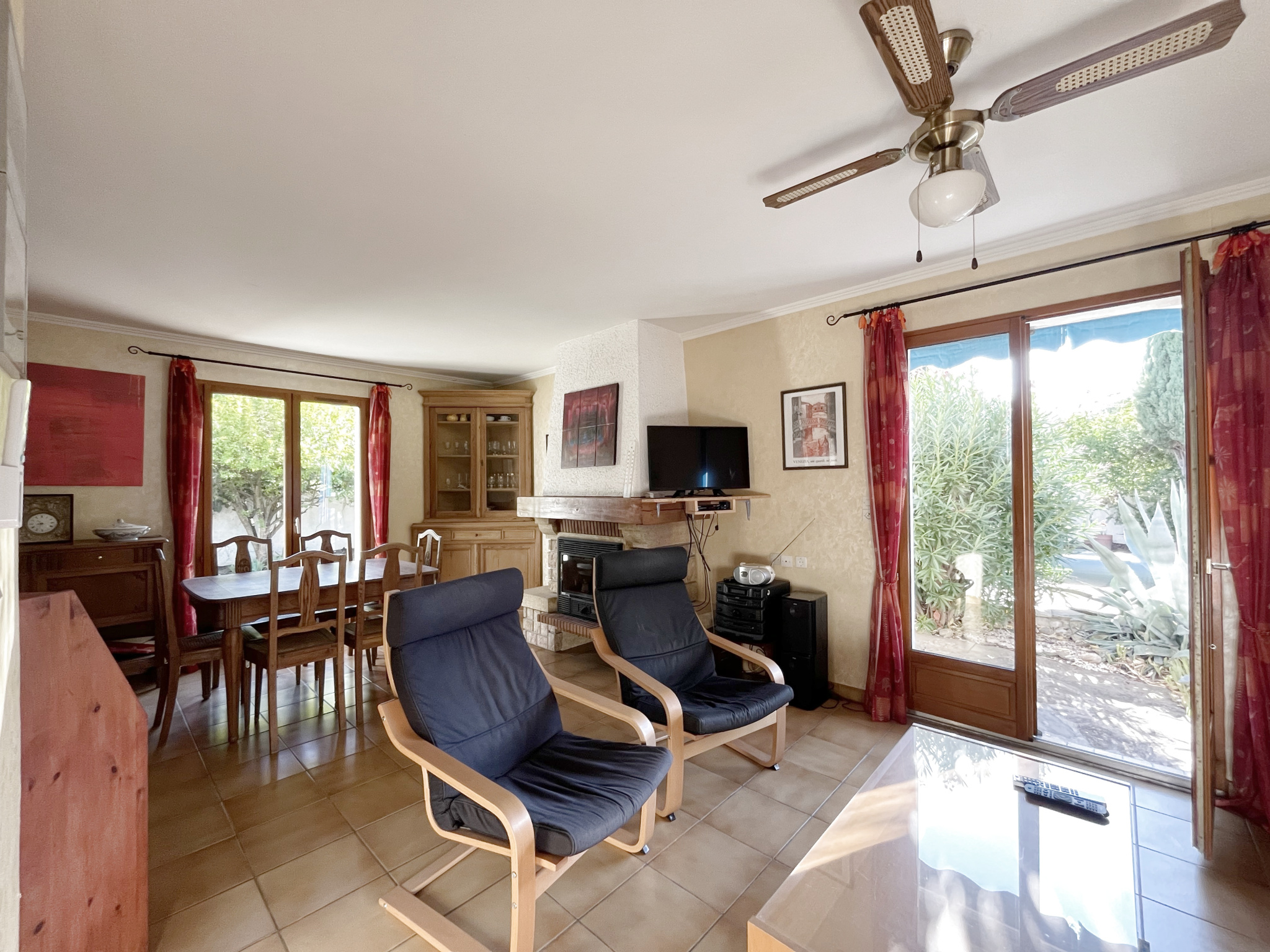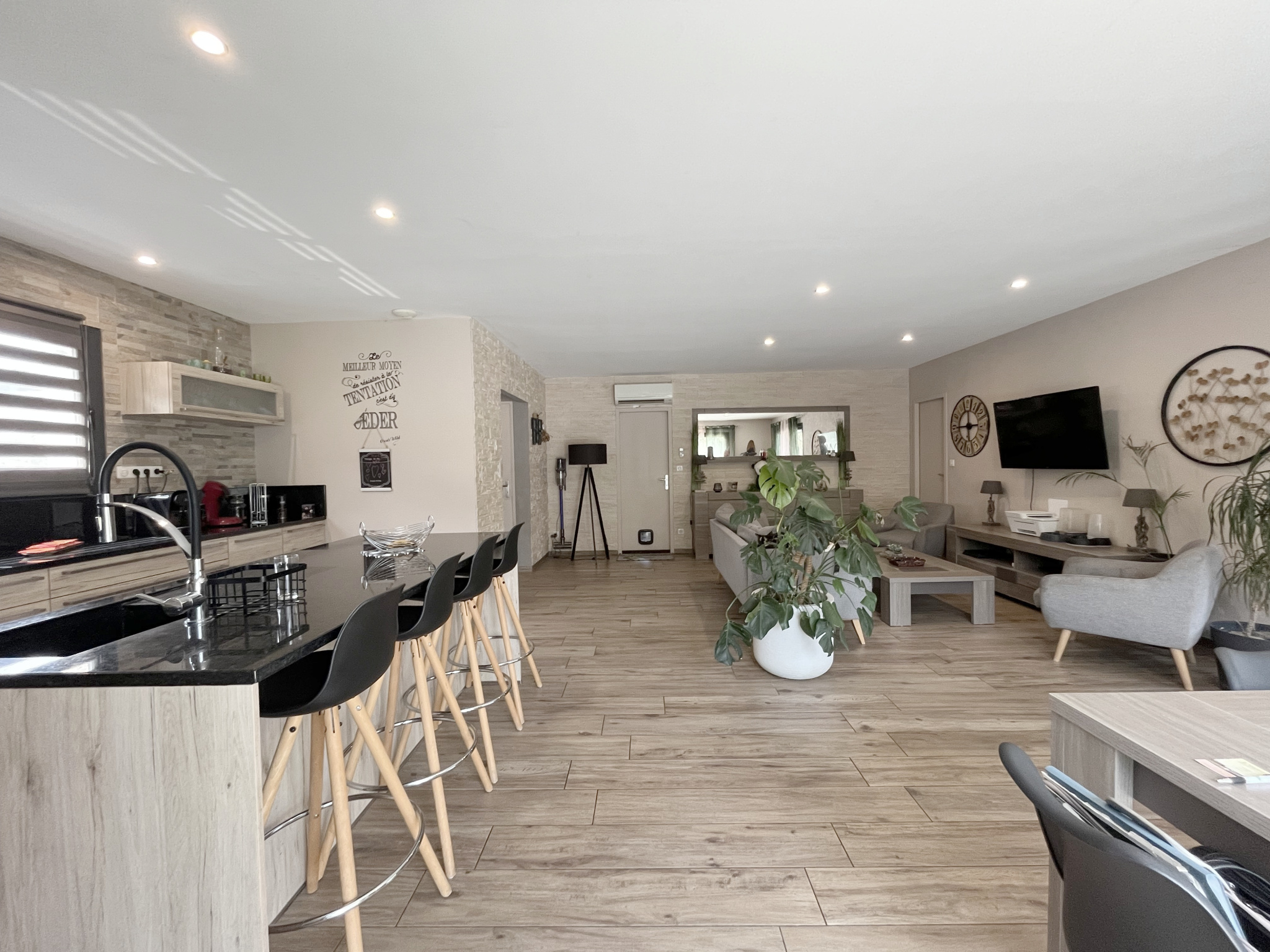 ...Une pièce de vie lumineuse et ouvertures traversantes sur le jardin et la cour, cuisine ouverte...