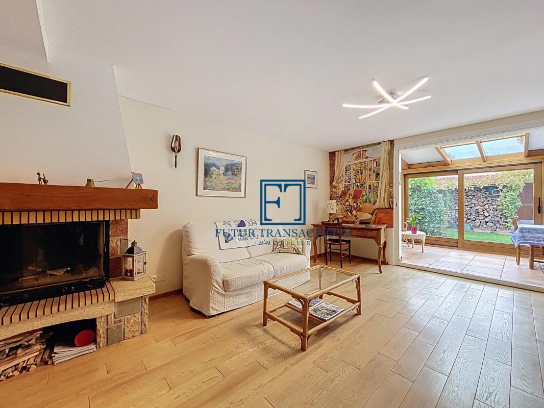 ...Maison avec salon 19 m² avec pierres apparentes et sa cheminée, salle à manger 29 m², cuisine...