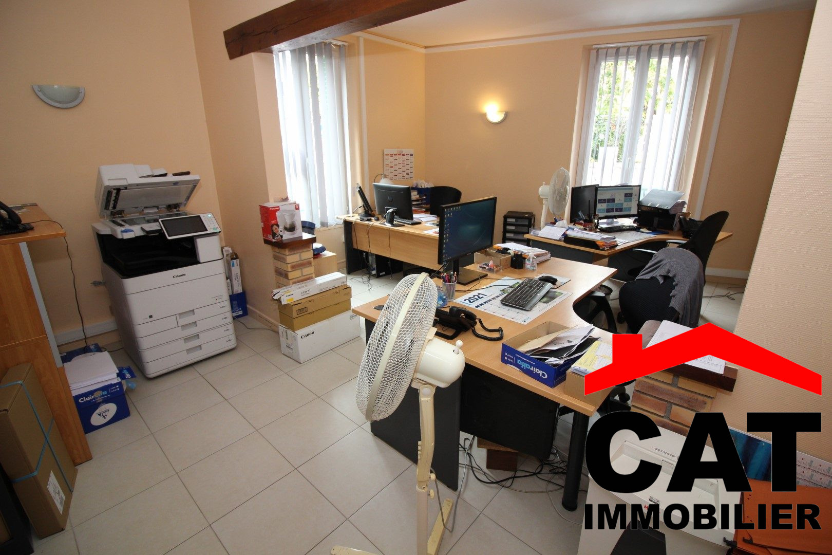 ...A l'étage : palier desservant deux bureaux et une cuisine (ancienne salle d'eau)...